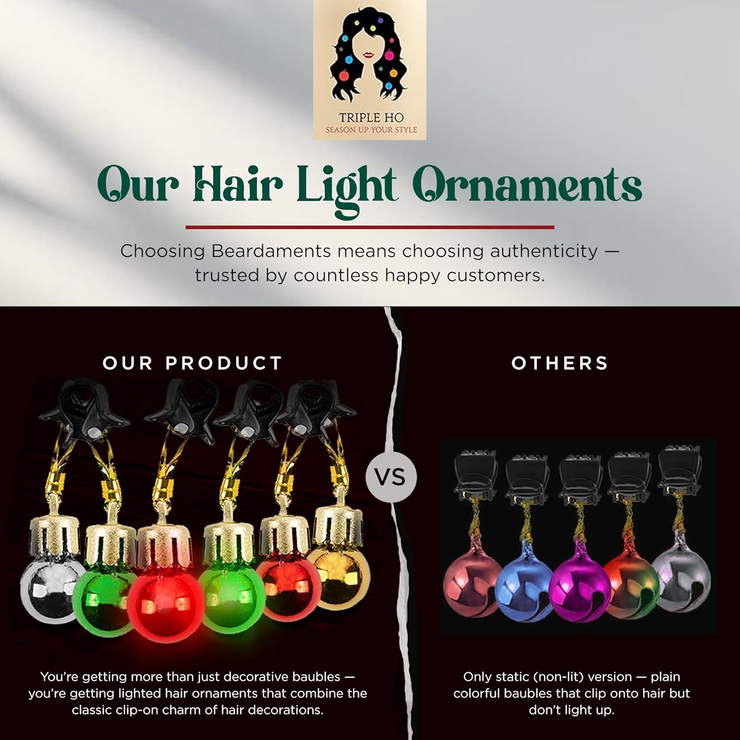 Light-Up Christmas Hair Accessories for Women: Beardaments Christmas hair clips feature 3 red and 3 green flashing lights, along with 10 fun ornaments. These accessories add a festive glow to your hairstyle, perfect for Christmas parties, holiday events, and cosplay.