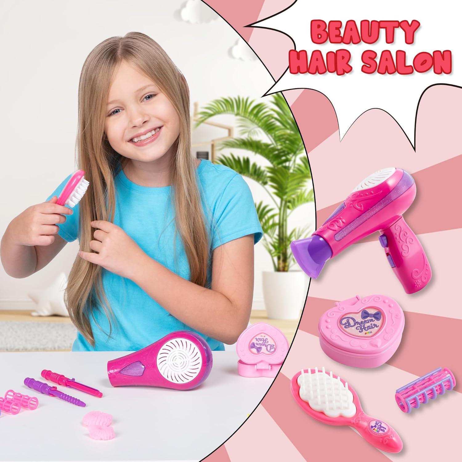 COMPREHENSIVE SET. Princess Beauty Hair Dresser Salon Kit includes hairdryer with 2 switches, 1 mirror, 2 different styles of curling wands, 2 curlers, 2 combs, 2 hair ties, 4 hair clips, and a jewelry box