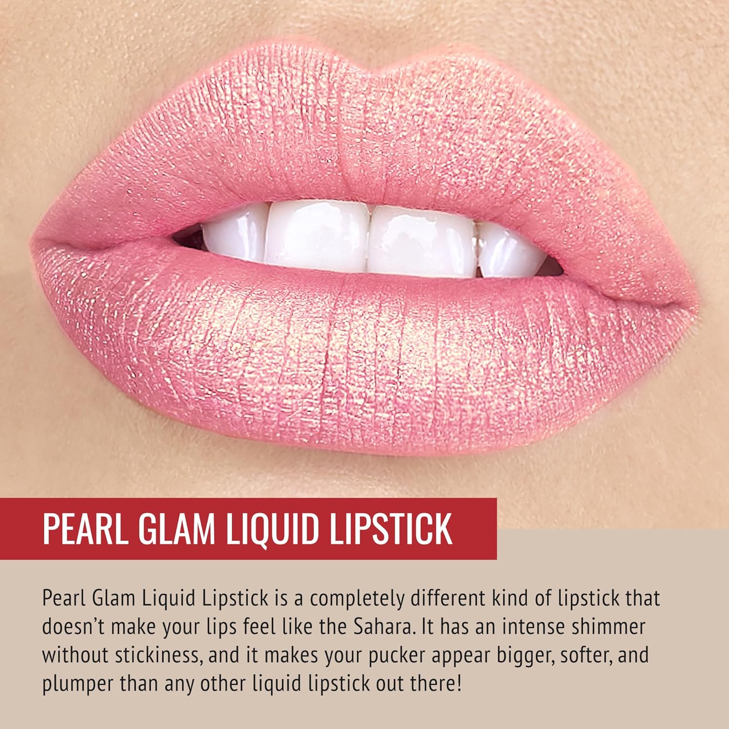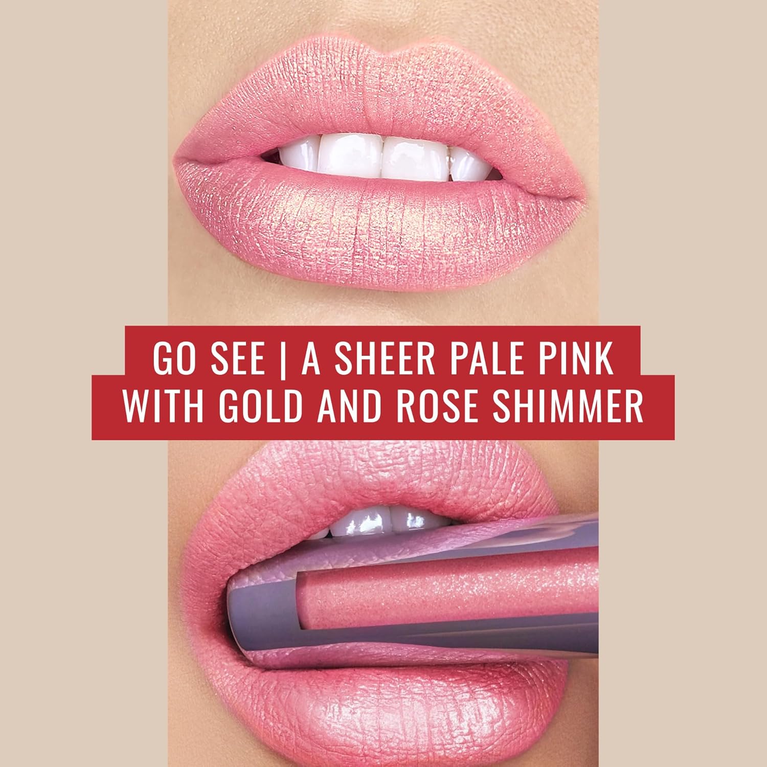 LONG WEAR LIQUID LIPSTICK: Pearl Glam liquid lipstick is a shimmering, lasting liquid lipstick infused with pearlescent pigments that stay all day and won’t make your lips feel like the Sahara. Our ‘Go See’ light-pink liquid-lipstick shade is a metallic matte infused with gold and rose shimmer.