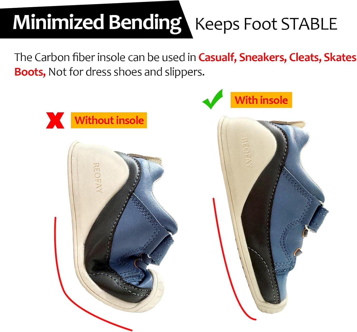 ❤How does Reofay carbon fiber insole work?❤ The rigid carbon fiber inserts will help alleviate common foot health problems in children such as joint pain, plantar fasciitis and Severs disease. With carbon fiber insert proper promote proper gait and reduce discomfort and fatigue, The insole helps promote healthy walking habits by providing support and balance