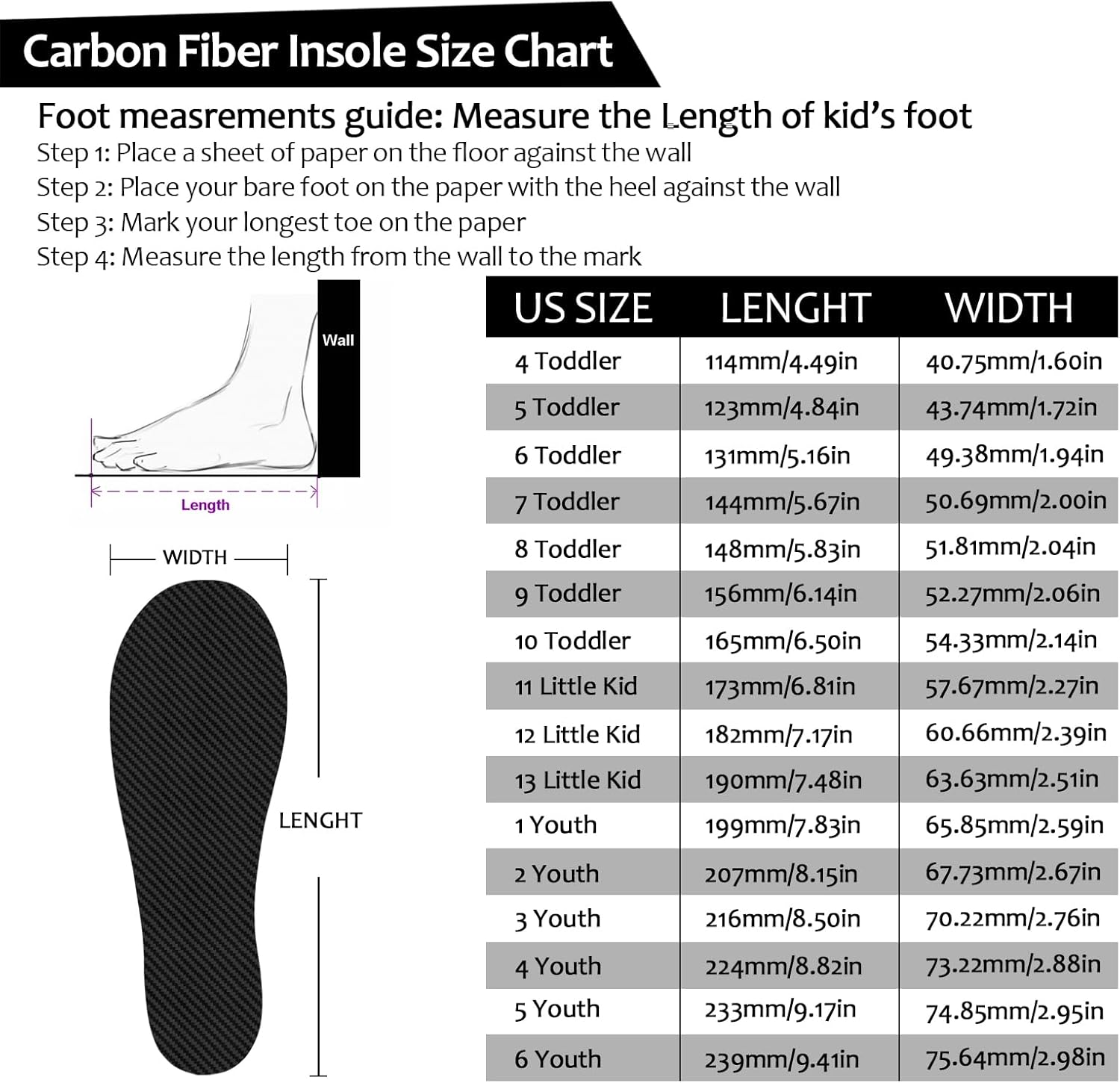 ❤How to choose the right size?❤ The carbon fibre inserts for Toddlers, Little kid and Youth now come in the sixteen sizes from the small 114mm to the 239mm one. They are sold as 1 Pair. Simply measure the length of the insole in the shoe of the child and order that length. Going 5 or so mm shorter is usually not a problem.