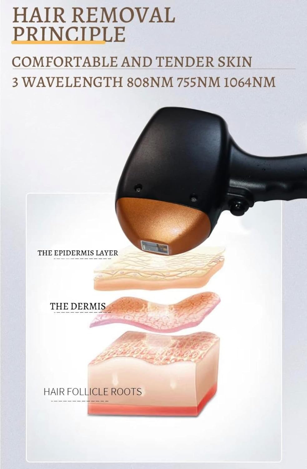 2. Application – Safe hair removal for almost all skin types, large spot size, more efficient hair removal for large areas. Rejuvenates ma