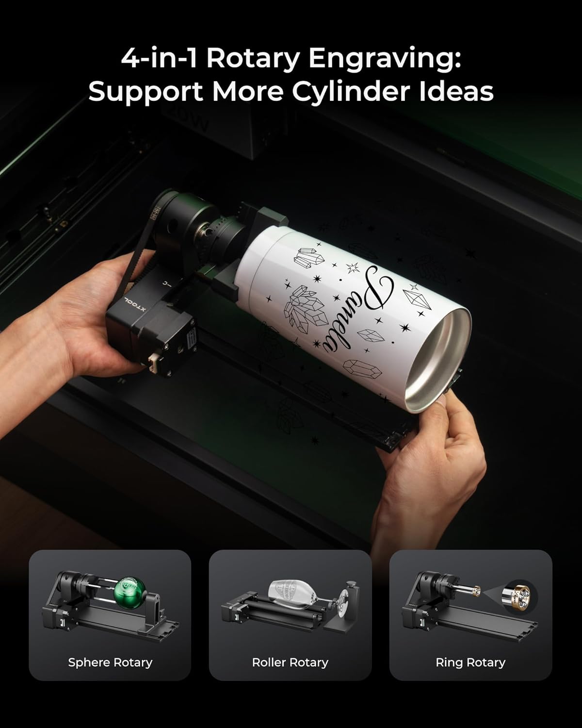 【Realize All Your Creative Ideas】xTool S1 Class 1 20W(20,000mW) effortlessly cuts through 10mm wood in one pass in a 3X faster speed up to 600mm/s. The S1 laser engraver rotary kit includes Smart Air Assist providing an automatic airflow of up to 30L/min for a cleaner surface, and the RA2 Pro Rotary and riser enables cylinder engraving, ensuring your work on tumblers, mugs, roller, chuck, sphere, and ring rotary engraving.Note: The Riser Base not compatible with the auto conveyor feeder.