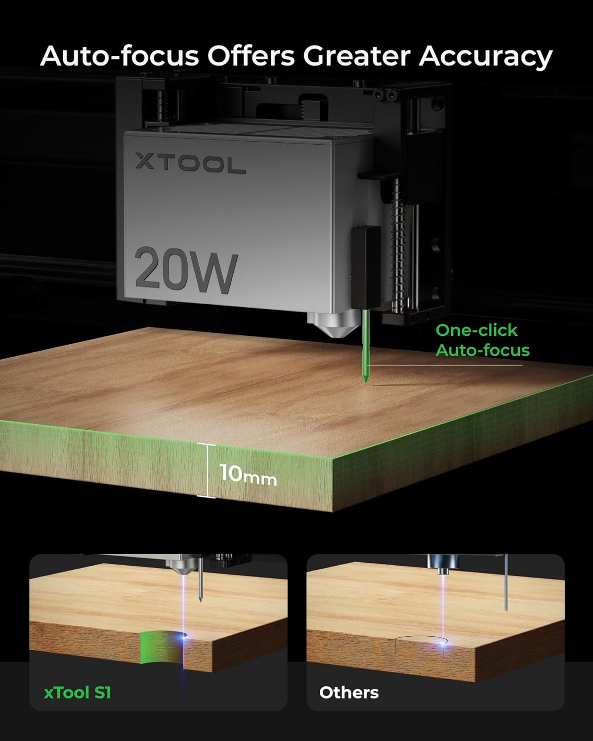 【Dynamic Auto-focus for Curved Surface and Thicker Cut】The high-precision auto-focus system intelligently guides the laser beam below the object’s surface for thicker cutting (10mm wood in one pass). The xTool S1 laser engraver also dynamically adjusts the Z-axis for multi-point measurements and automatically constructs a 3D model for perfect 3D laser print on uneven surfaces. No matter what you can imagine, the xTool S1 laser tool helps you to create.