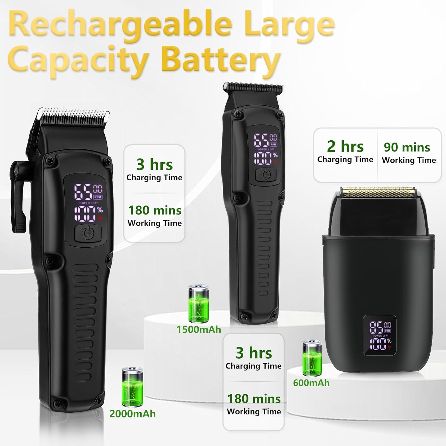 【Large Capacity Battery & Smart LED Display】Big men’s clippers and beard trimmer are fully charged in 3 hours and provides up to 180 minutes of trim run time.The razors for men only needs 2 hours of charging to get up to 90 minutes of cordless runtime.Trimmers and razor are equipped with a digital display to remind you of timely charging, remaining power and display speed.USB charging is designed to be available anywhere, anytime.