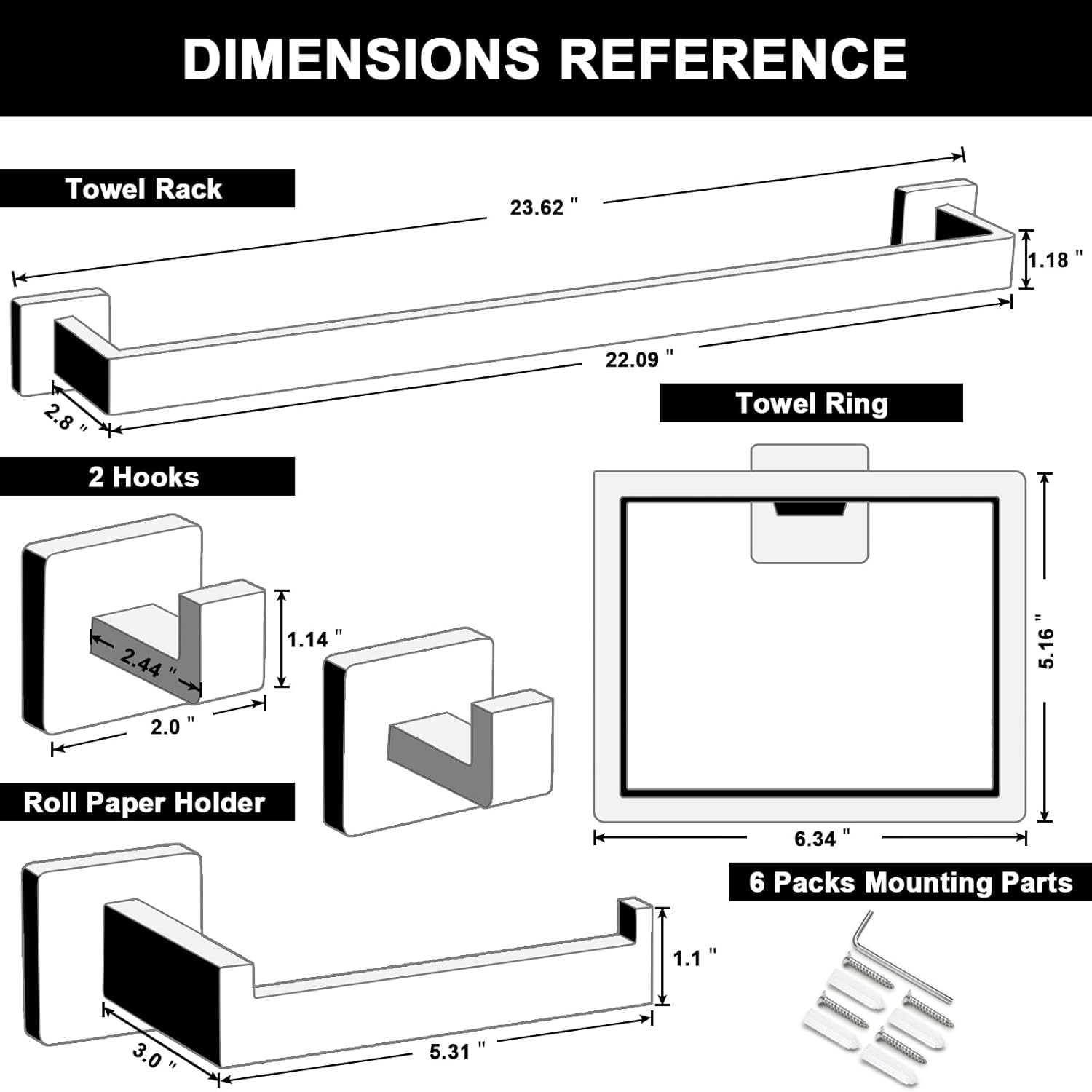 ♥ MODERN & SAFE DESIGN: Designed with clean lines and sturdy construction, the bathroom accessorries sets provide everyday efficiency with style. Unique squared shape and concealed mounting hole add a touch of modern design to your bathroom, chamfering edges protect your body from scratching.