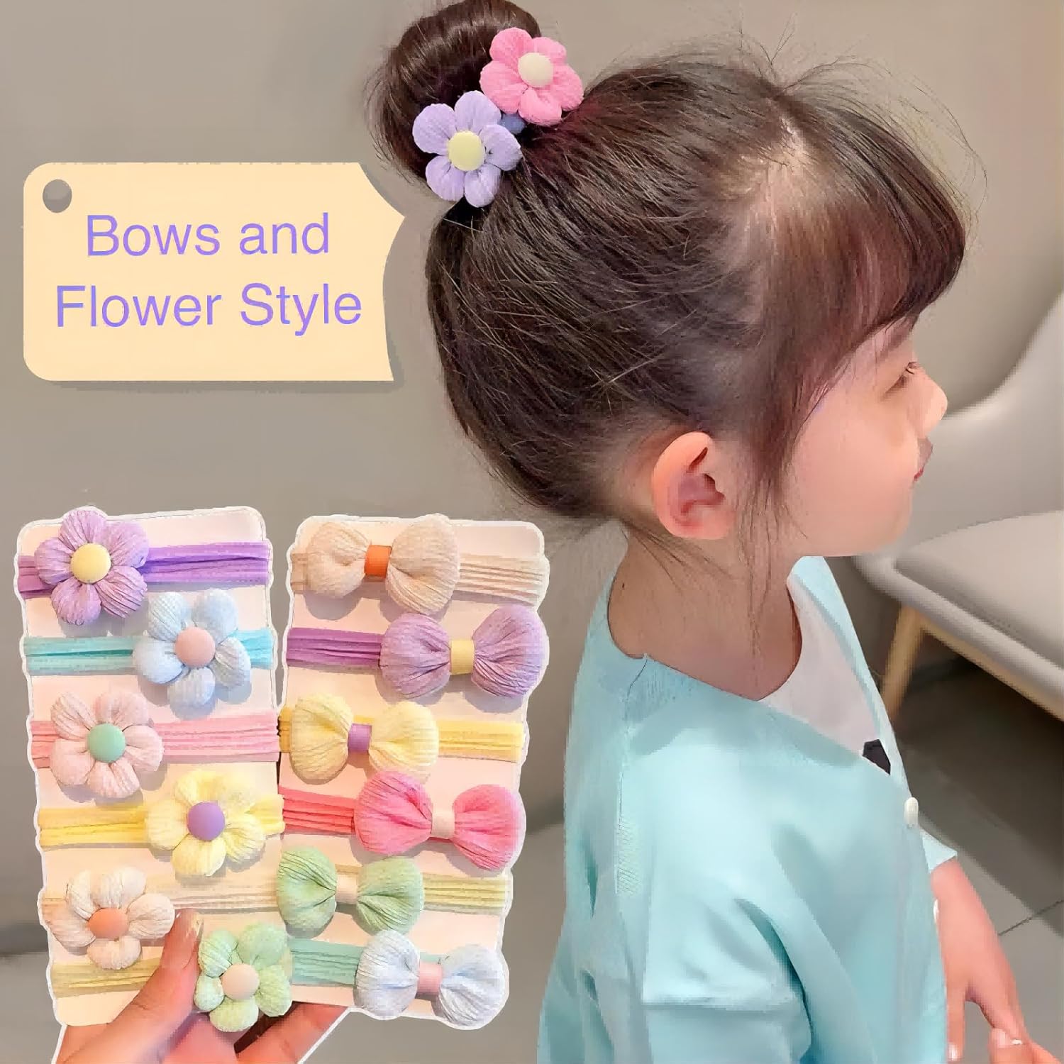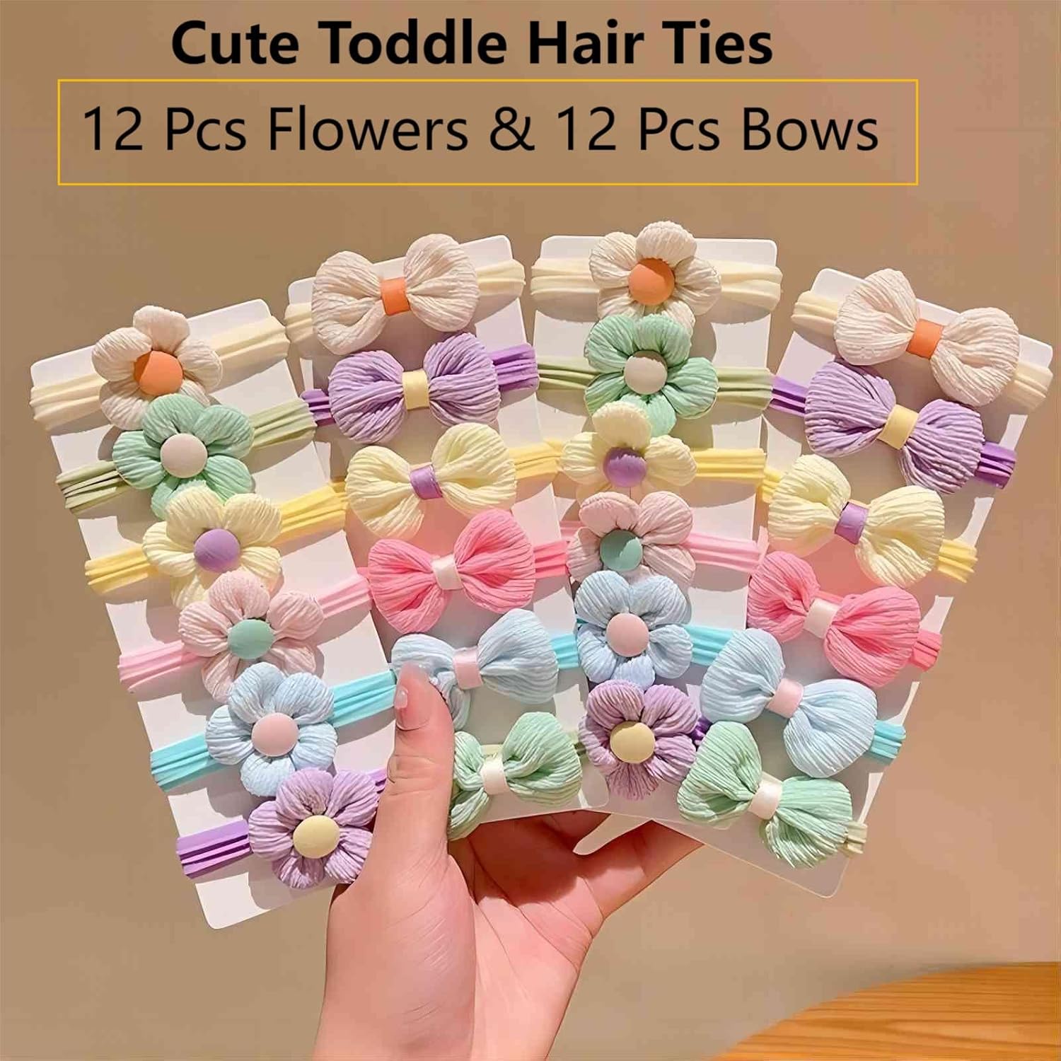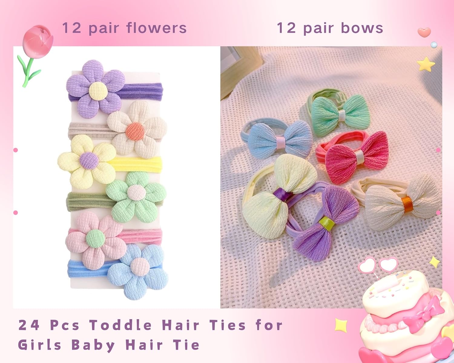 Cute Toddler Hair Tie:The cute baby hair ties set came with 24 pcs hair ties with bows and flowers,includes 12 pieces(6 pairs ) of hair ties in fun flower shapes and 12 pieces(6 pairs ) of hair ties in cute bow shapes.many colors and styles to match your girls every outfit,different styles for your little girl to hair decoration.