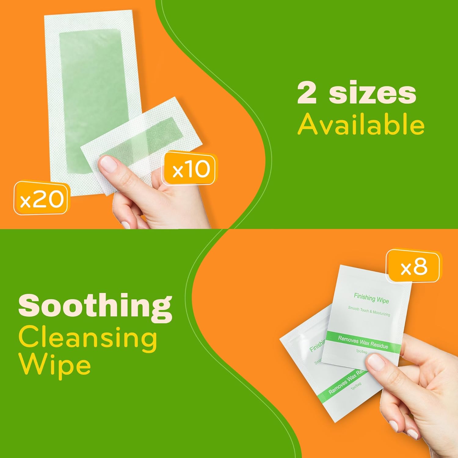 FACE, BODY, BIKINI: Our double-sided waxing sheets are available in 20 Body trips and 10 Facial Strips for Face, Arms, Legs, Underarms and Bikini plus 8 calming oil wipes—sufficient for at least 20 home waxing sessions.
