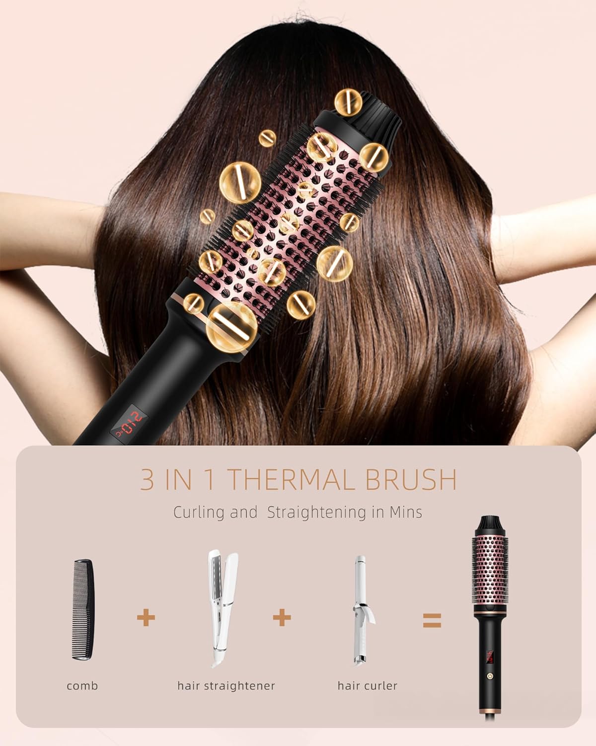 【Ceramic Tourmaline Ionic Technology 4X Less Damage & Frizz】The heated round brush with ceramic tourmaline barrel emits direct negative ion penetrating the hair quickly to help lock in moisture, nourish damaged hair and split ends, reducing frizz, static and kinks to make hair smoother and shinier. With our Tourmaline heated brush for healthy hair, leaving your hair looking healthy and shiny.