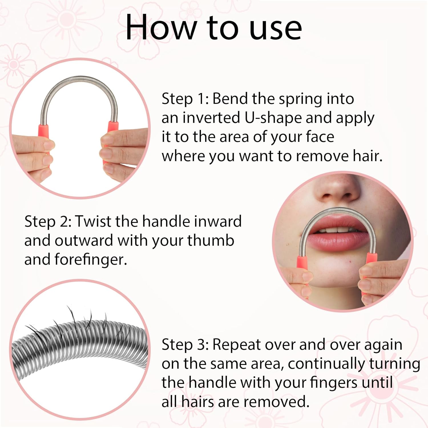 【Quick Hair Removal】: Handle Hair Epilator Tool and facial hair remover for women face can removes unwanted facial hair from the roots naturally,Simply bend the Spring Hair Remover, place it on your face where you want to remove facial hair, and use your fingers to turn the handle continuously, first outward and then inward, for fast hair removal!