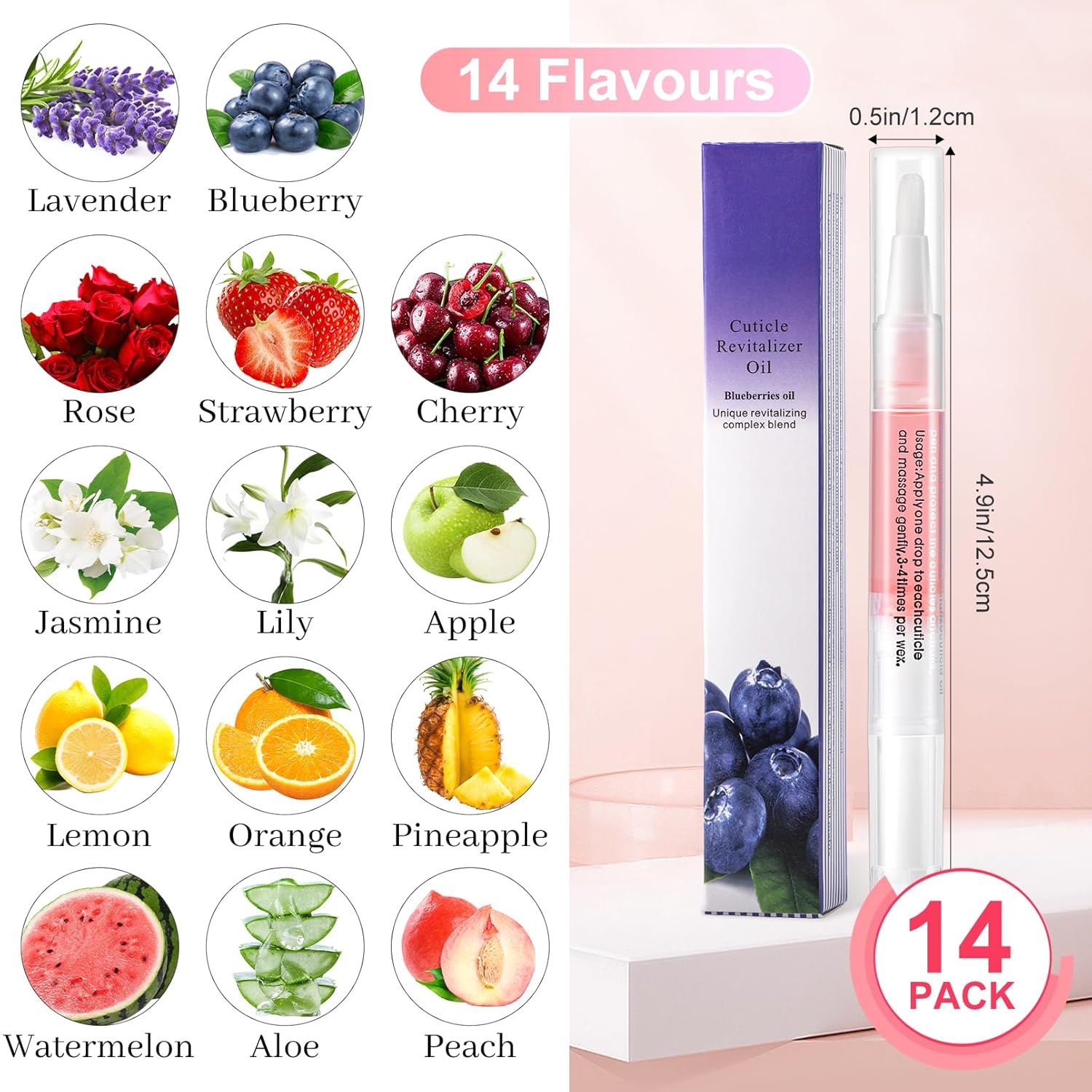 Multiple Flavors: Package includes 14 cuticle oil pens. You can choose from 14 flavors in this nail care set ( lavender, blueberry, cherry, rose, strawberry, apple, jasmine, lily, lemon, orange, pineapple, watermelon, aloe vera, peach ).