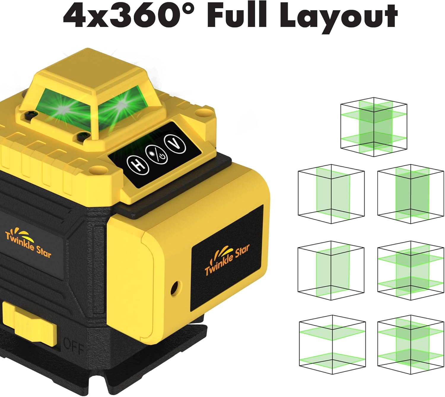 【4×360° Lasers Full Layout】Laser level 360° self leveling constructed with two 360° horizontal lines and two 360° vertical lines,providing complete coverage of all angles within a room. The “H” designation represents the horizontal laser, while the “V” designation represents the vertical laser, allowing for easy control and the ability to select which line to activate or deactivate.