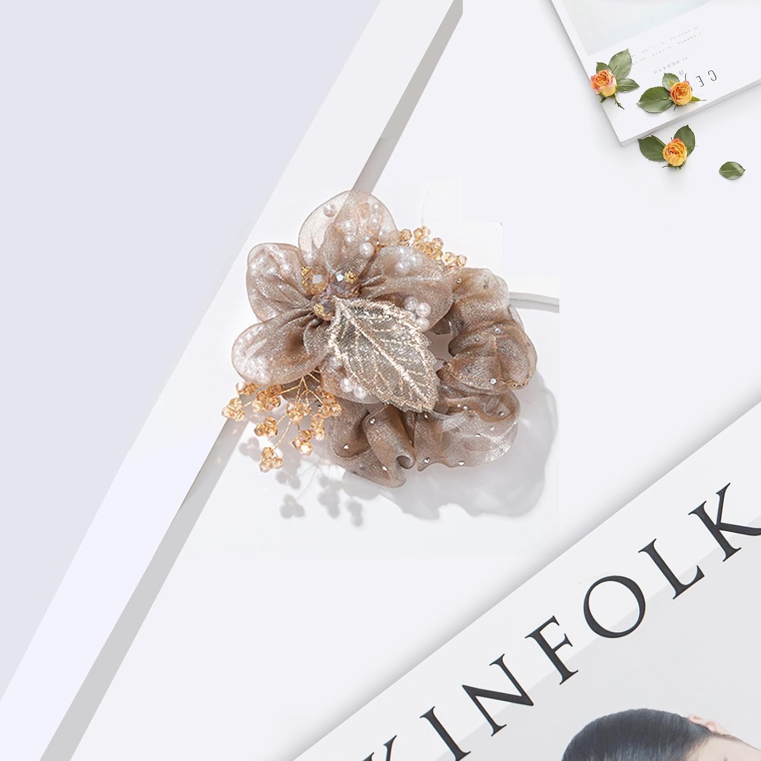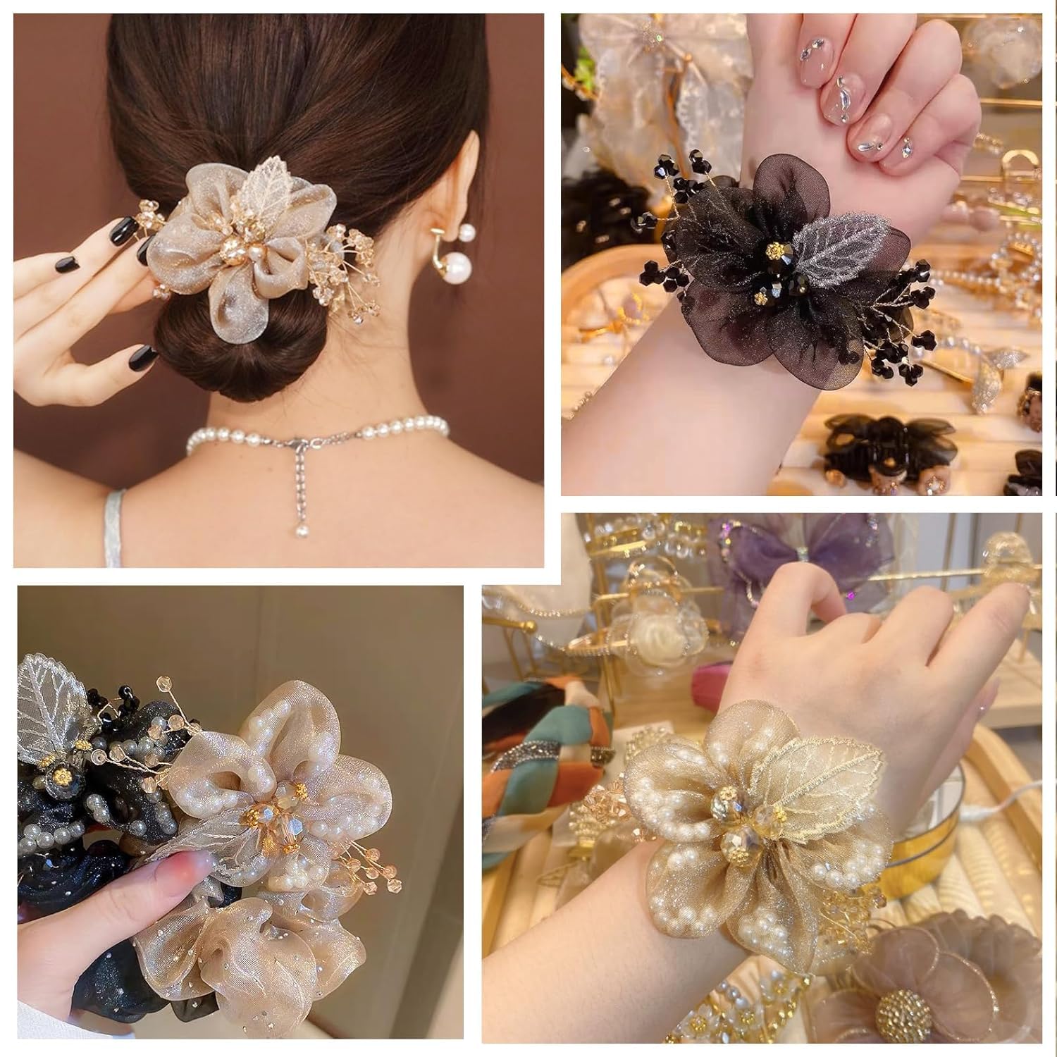 🌸【Good Quality】These gorgeous flower hair ties for women are made of high-quality organza flower, pearl and crystal beads, and the elastics rubber band inside is stretchy, which comfort wear and prevent hair tangling and breakage when use it.