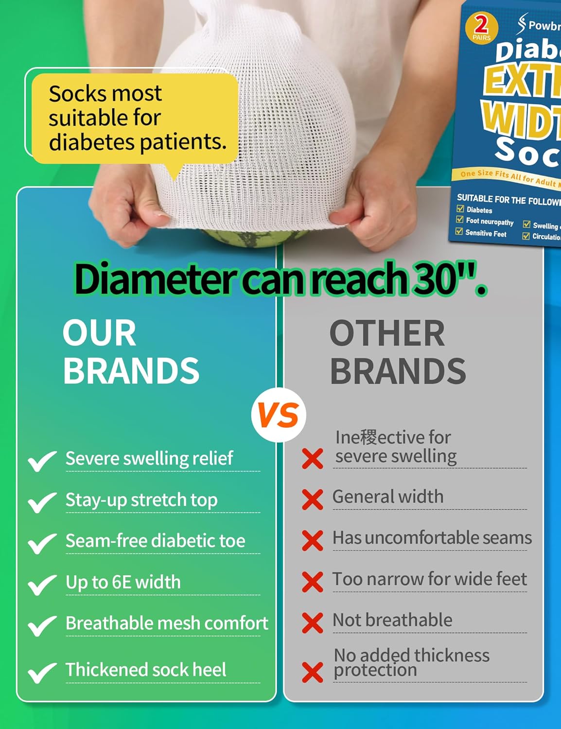 【Diabetic Socks for Swollen Feet】Powbrace Super Width Diabetic Socks, designed for the protection and comfort of diabetic patients, feature a thicker footbed and a non-binding design at the sock opening to improve swelling and pain in the legs and feet of diabetic patients. The sock opening can stretch up to 30 inches wide, and it includes an anti-slip design to prevent slipping down to the ankles during prolonged wear. An ideal choice for diabetic and edema patients.
