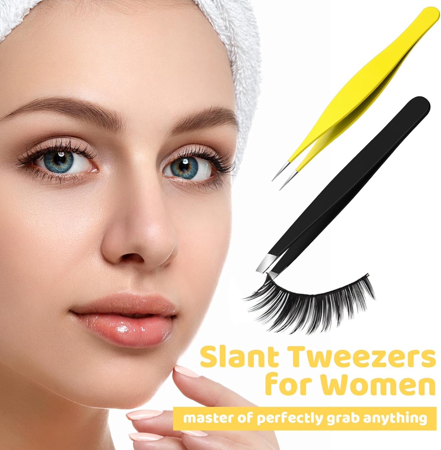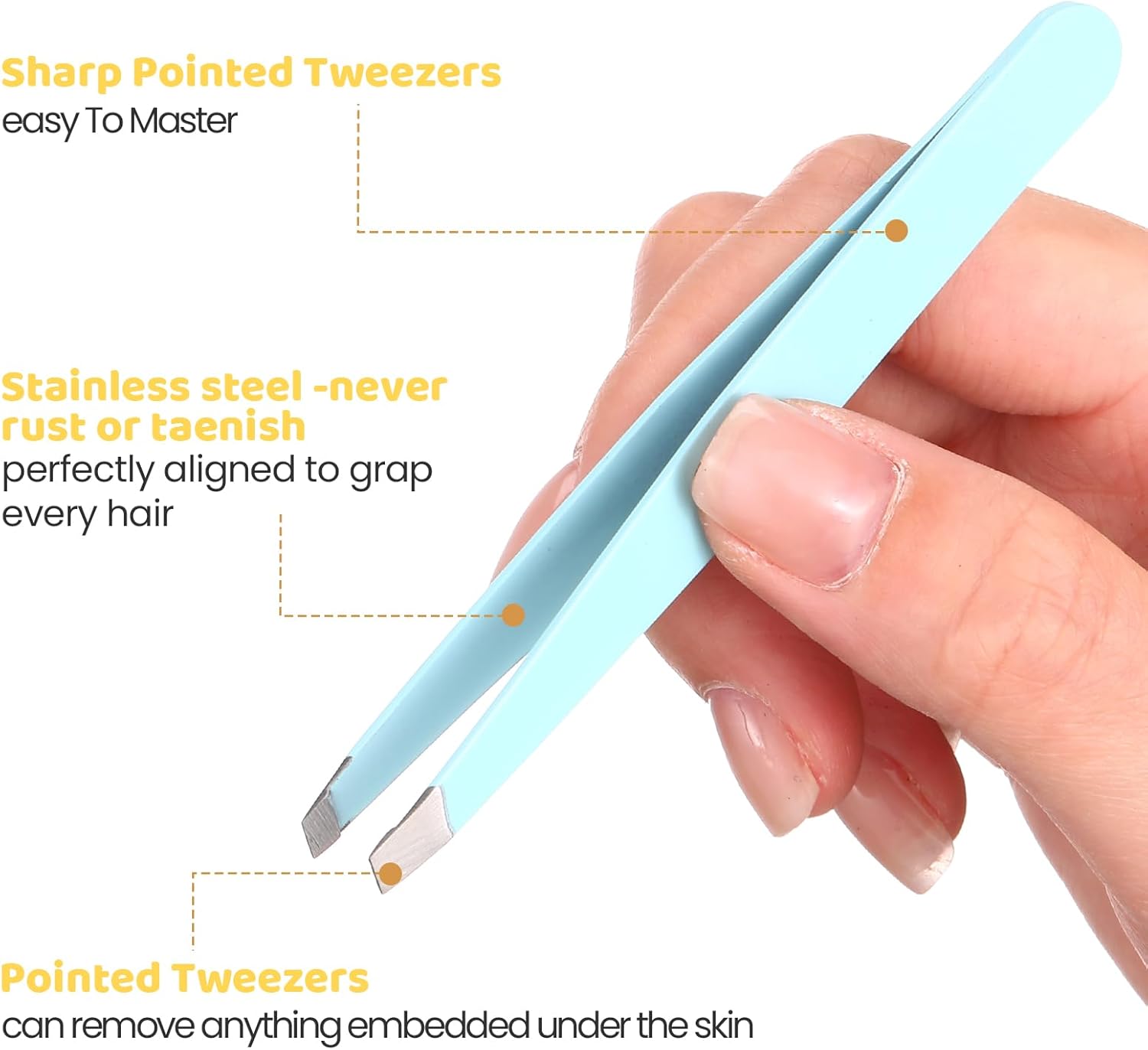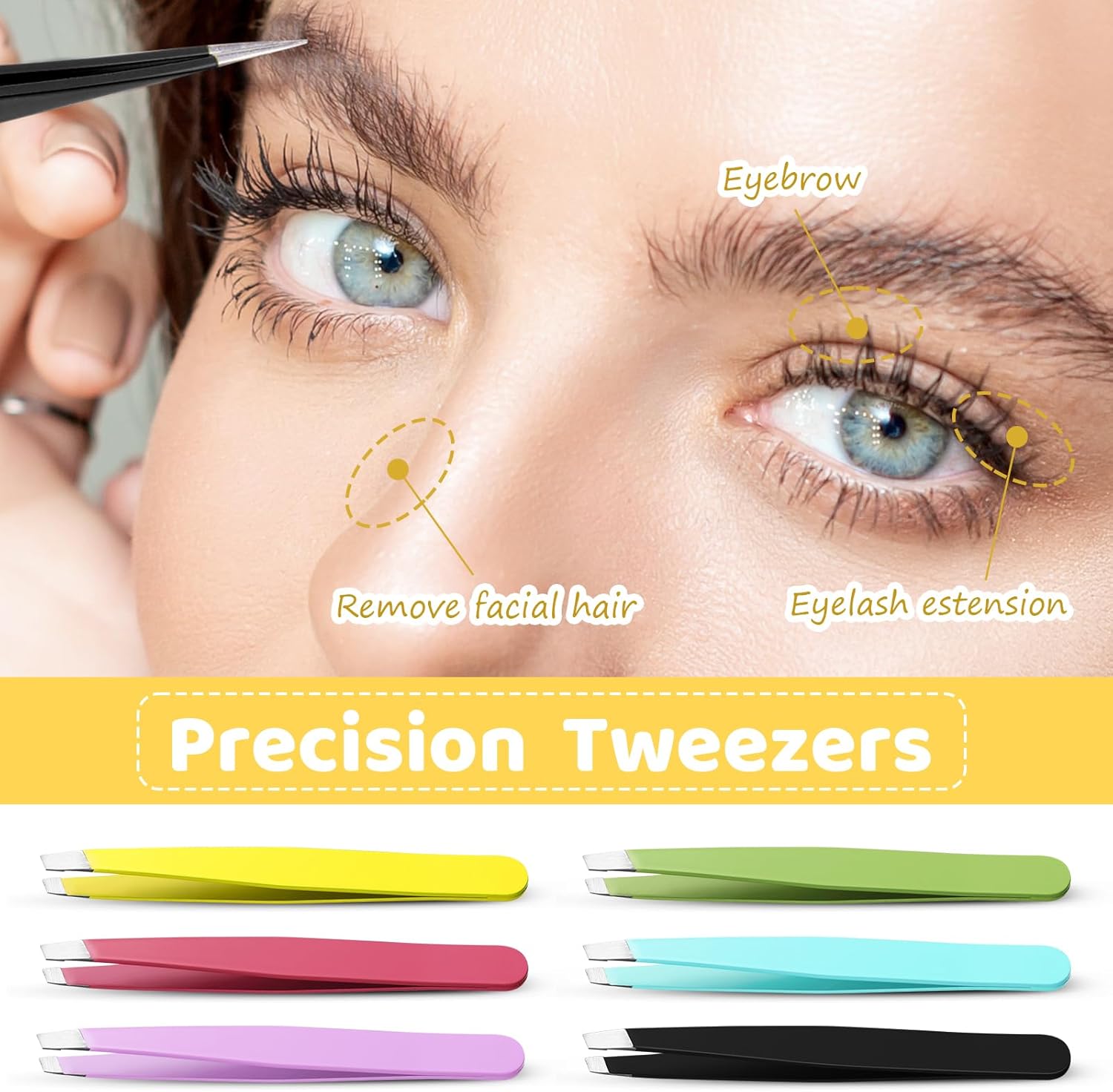 Comprehensive Tweezers Set for All Your Needs: embrace diversity and versatility with our tweezers for women facial hair that includes 12 slanted eyebrow tweezers and 12 pointed tweezers; These point tweezers come in 5 different colors, including black, yellow, green, purple and blue to not only cater to your beauty and grooming needs, but also add an aesthetic value to your personal care tools