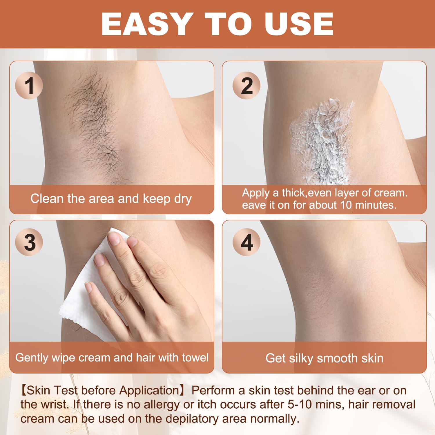 【Painless Depilatory Cream】Skin Test before Application,Perform a skin test behind the ear or on the wrist. If there is no allergy or itch occurs after 5-10 mins, hair removal cream can be used on the depilatory area normally. Suitable for bikini hair removal, arms, legs, underarms, butt, and all skin types.