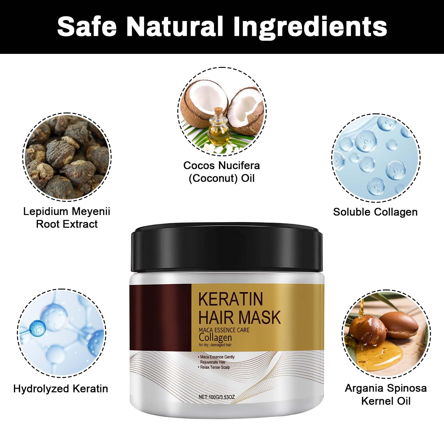 【Safe Natural Ingredients】Our hair mask is formulated with pure natural argan oil, coconut oil, maca extract, contains collagen, is gentle and safe, does not irritate the scalp, and repairs dry and damaged hair.