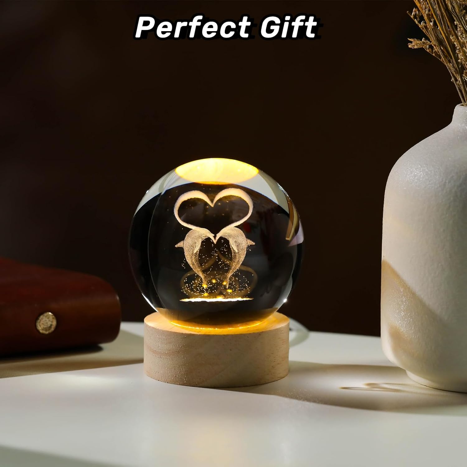 3D Dolphin Crystal Ball Figurines Gifts, Crystal Ball Lamp with Wooden Light Base, Laser Engraved Dolphin Glass Sphere Home Decor