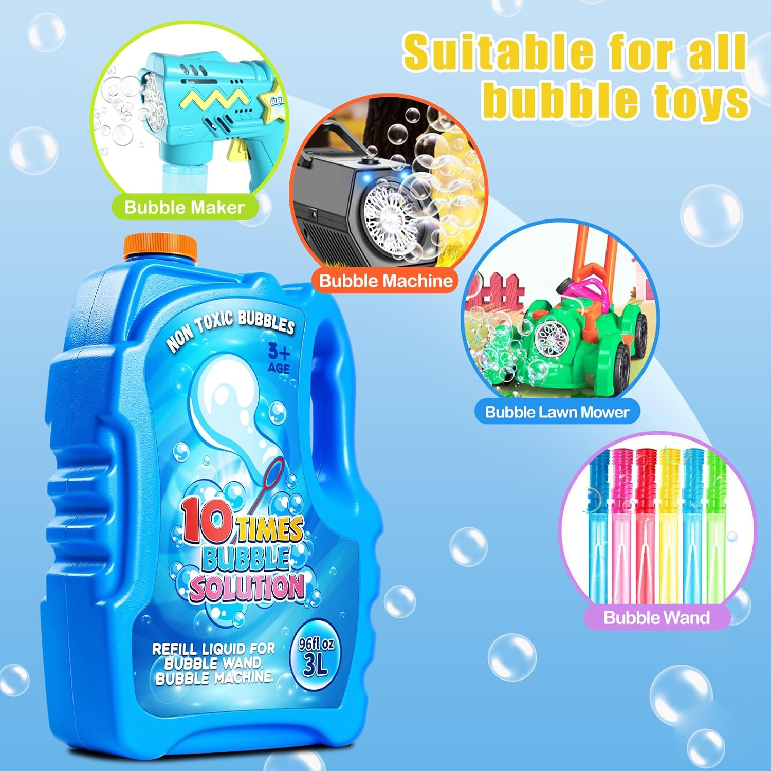 Perfect Bubble Refill Liquid: Our concentrated bubble solution is a perfect refill solution for all kinds of bubble toys, such as bubble lawn mower, bubble blaster, bubble blower toys, bubble wands and bubble gun toys. Keep replenishing your happiness!
