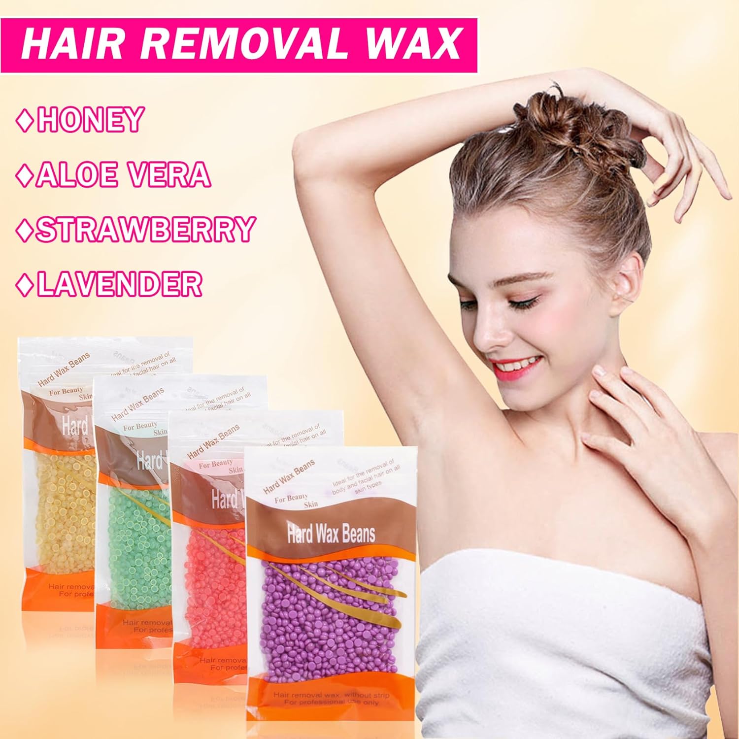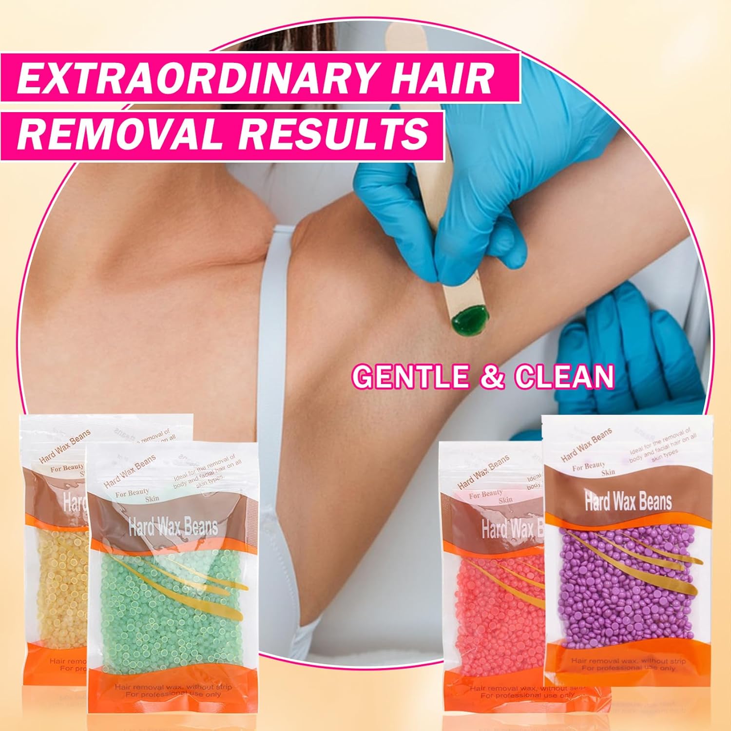 4 Pack Wax Beads for Hair Removal,Multi-colored Hard Wax Beads for Women & Men,At Home Waxing Beads Kit with Waxing Stick for All Body