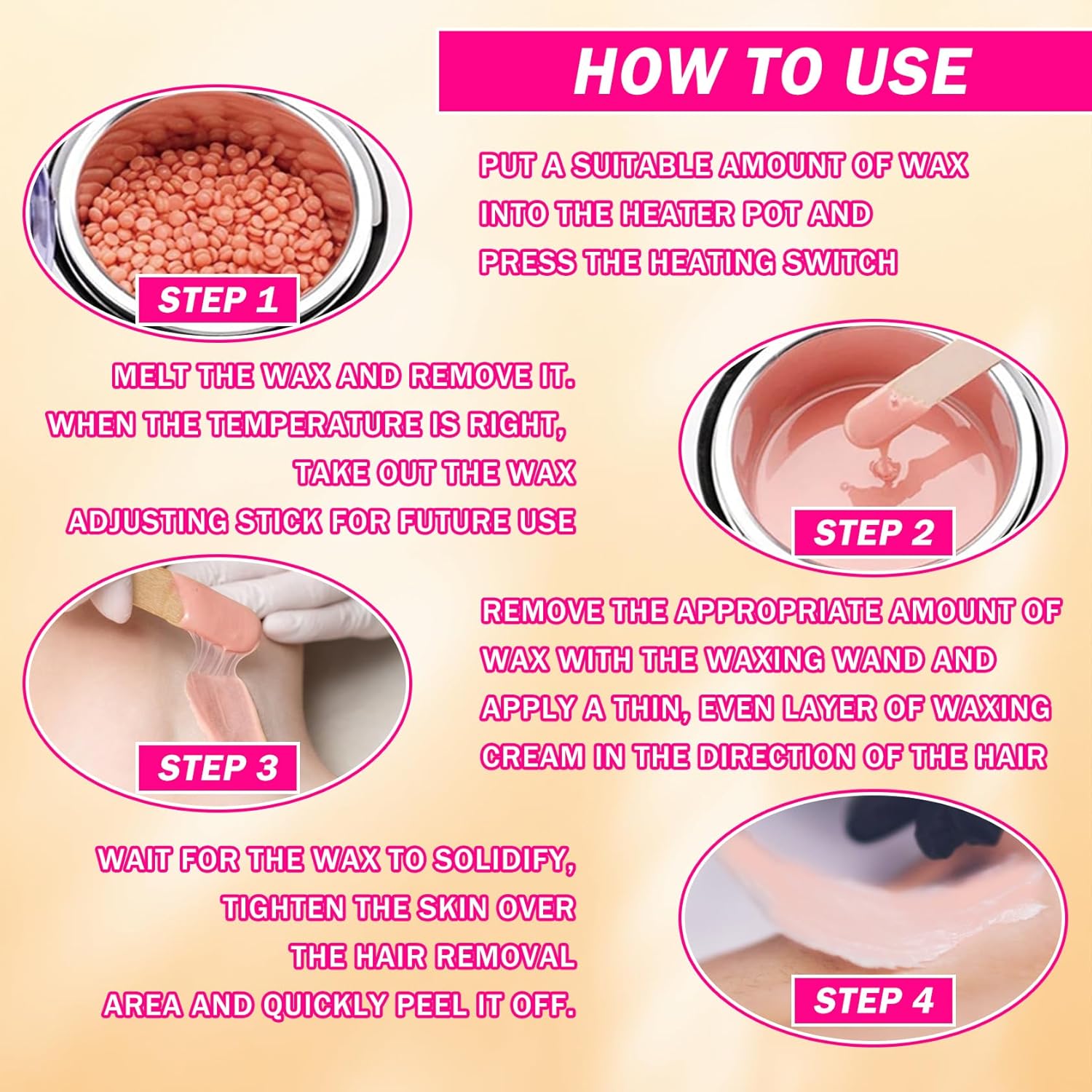 👍【Easy to Use】Hard wax beans is very simple to use, first take out the appropriate amount of wax beans into the heater to heat up to the right temperature, keep the skin clean, take out the appropriate amount of wax with the waxing stick and apply a thin layer of wax evenly along the direction of the hair, wait for the wax to solidify, and then tear off the beads of wax, which is very soft and gentle to the skin.