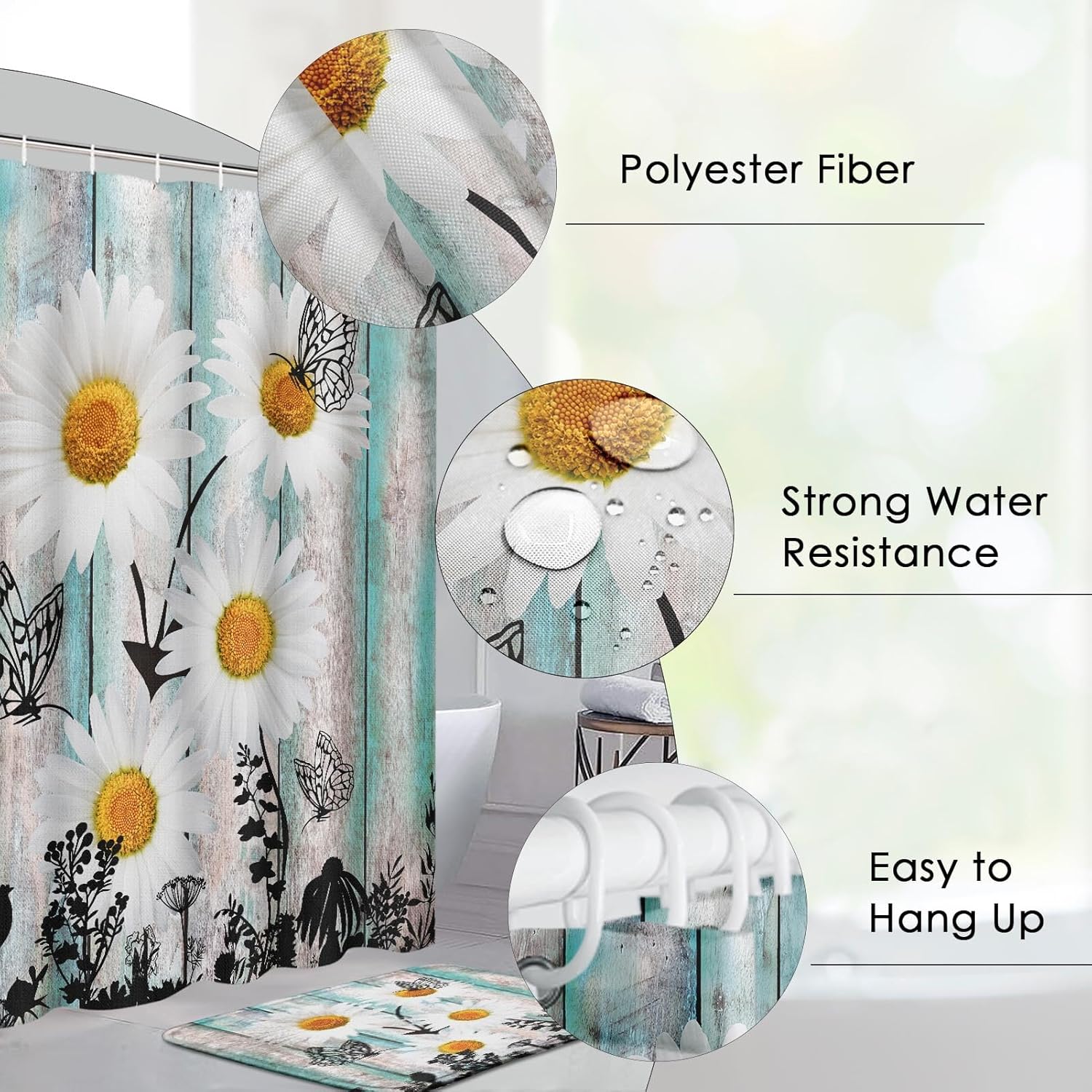 Waterproof Shower Curtain: It is made from durable polyester fiber. With its high-definition digital printing, it resists fading and offers excellent waterproof properties.