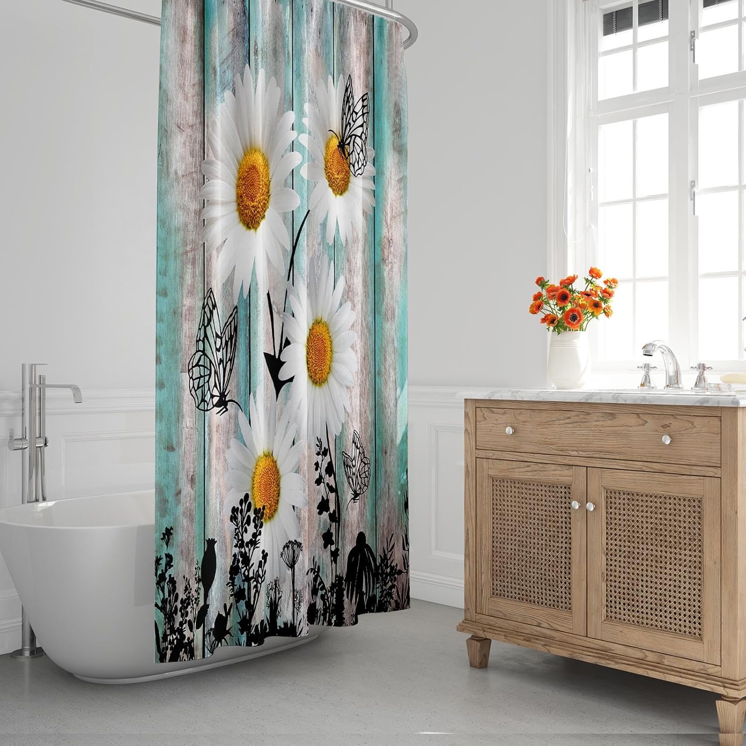 4 Pcs Shower Curtain Sets, Daisy Flower Plant Waterproof Bathroom Sets with Non-Slip Rugs, Toilet Lid Cover and Bath Mat, 12 Hooks, Accessories Modern Home Bathroom Decor 72″ X 72″