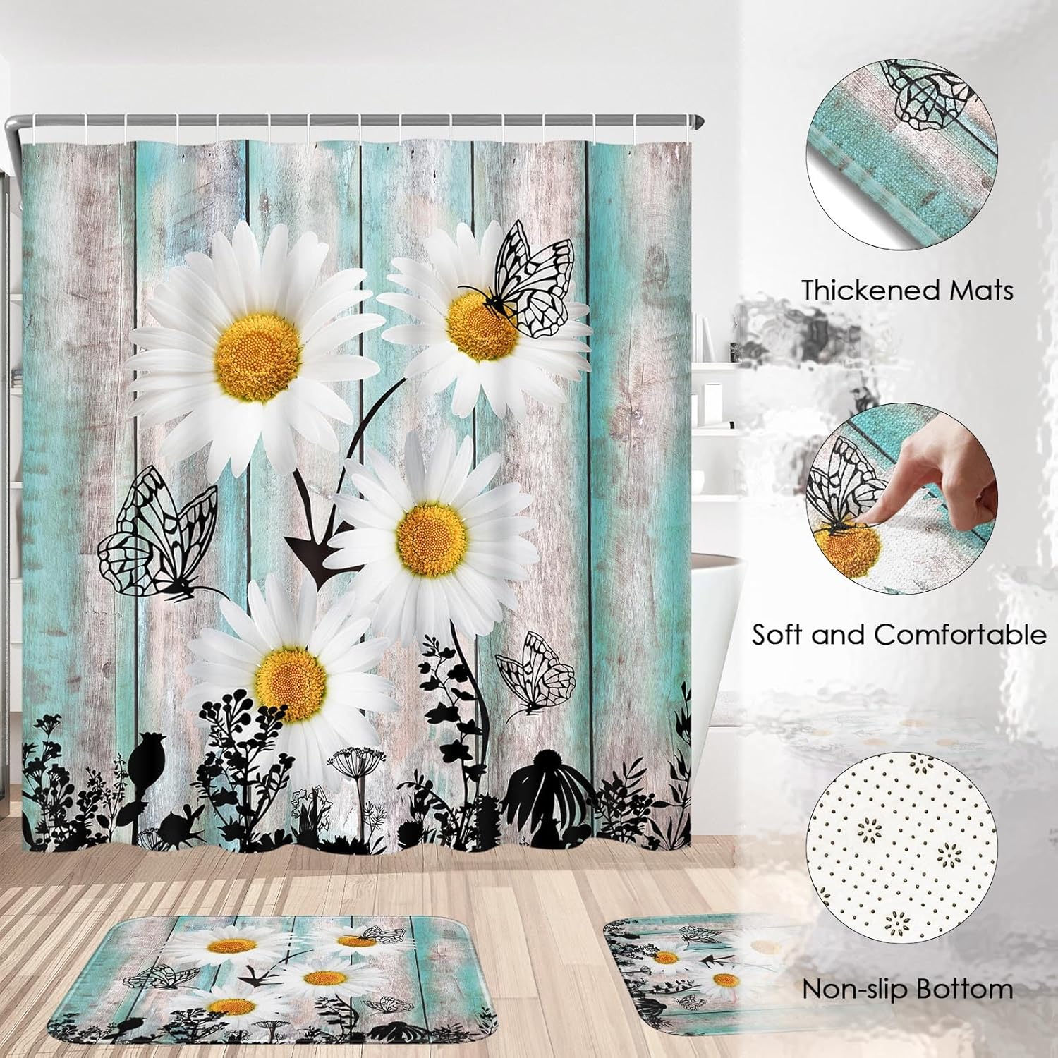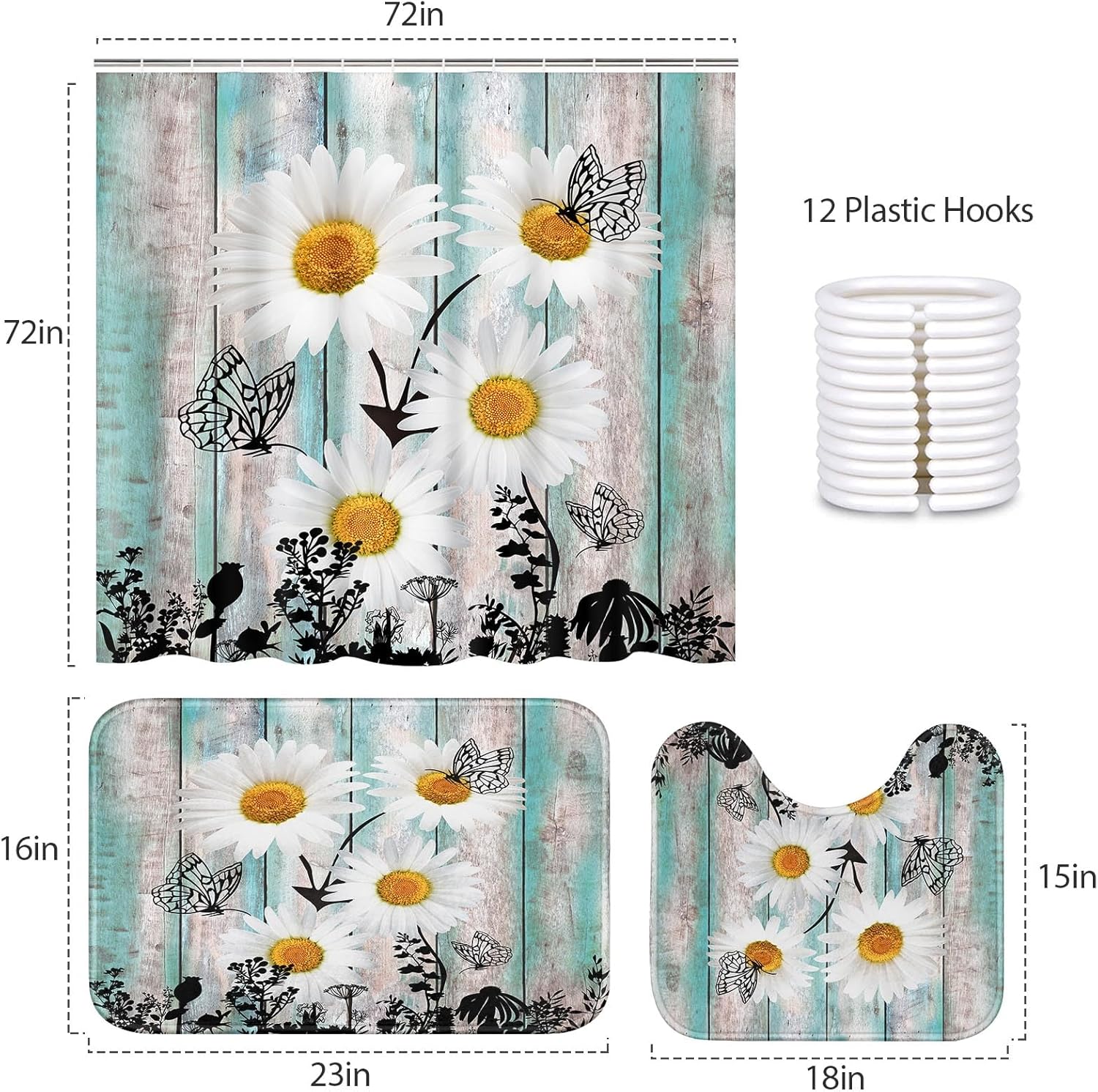 Be the first to review “4 Pcs Shower Curtain Sets, Daisy Flower Plant Waterproof Bathroom Sets with Non-Slip Rugs, Toilet Lid Cover and Bath Mat, 12 Hooks, Accessories Modern Home Bathroom Decor 72″ X 72″”