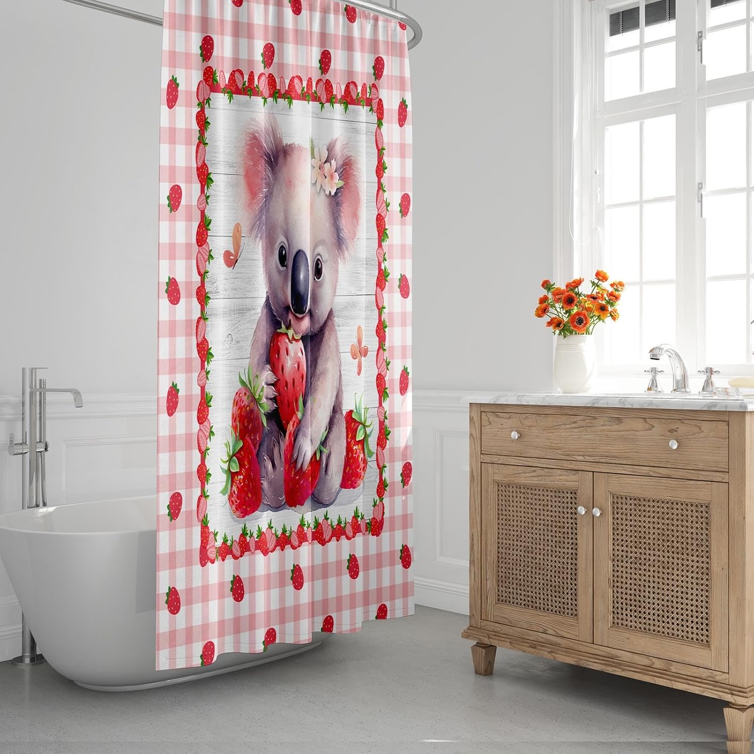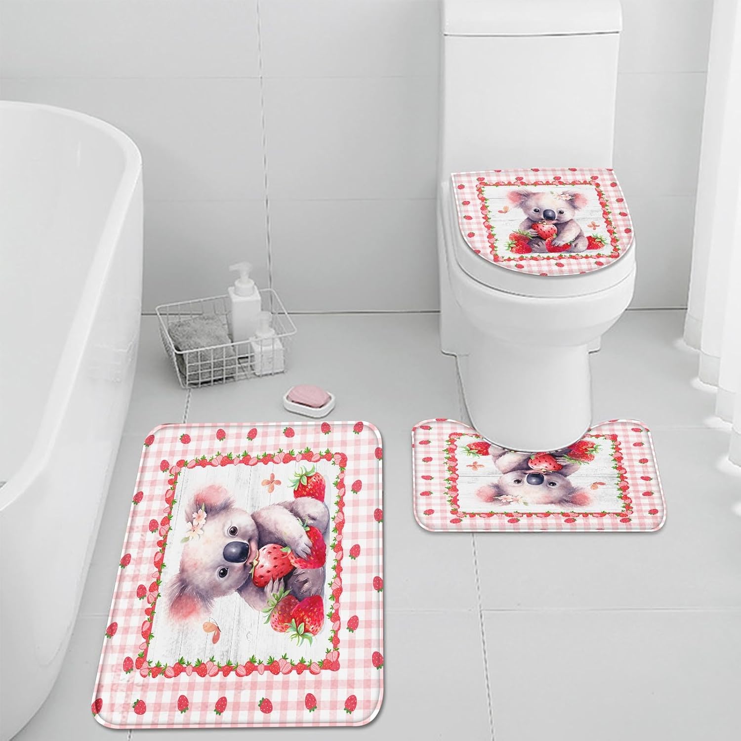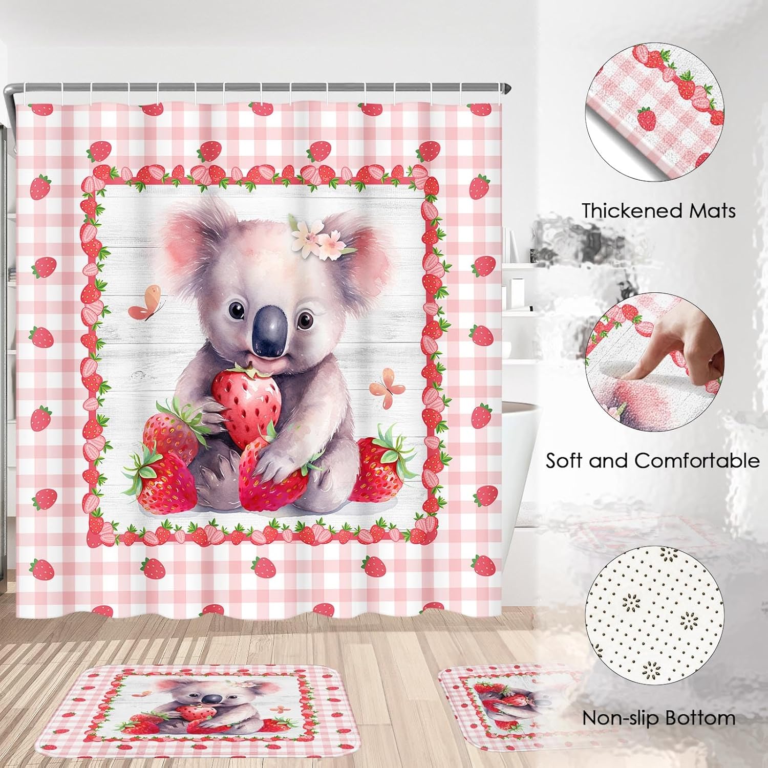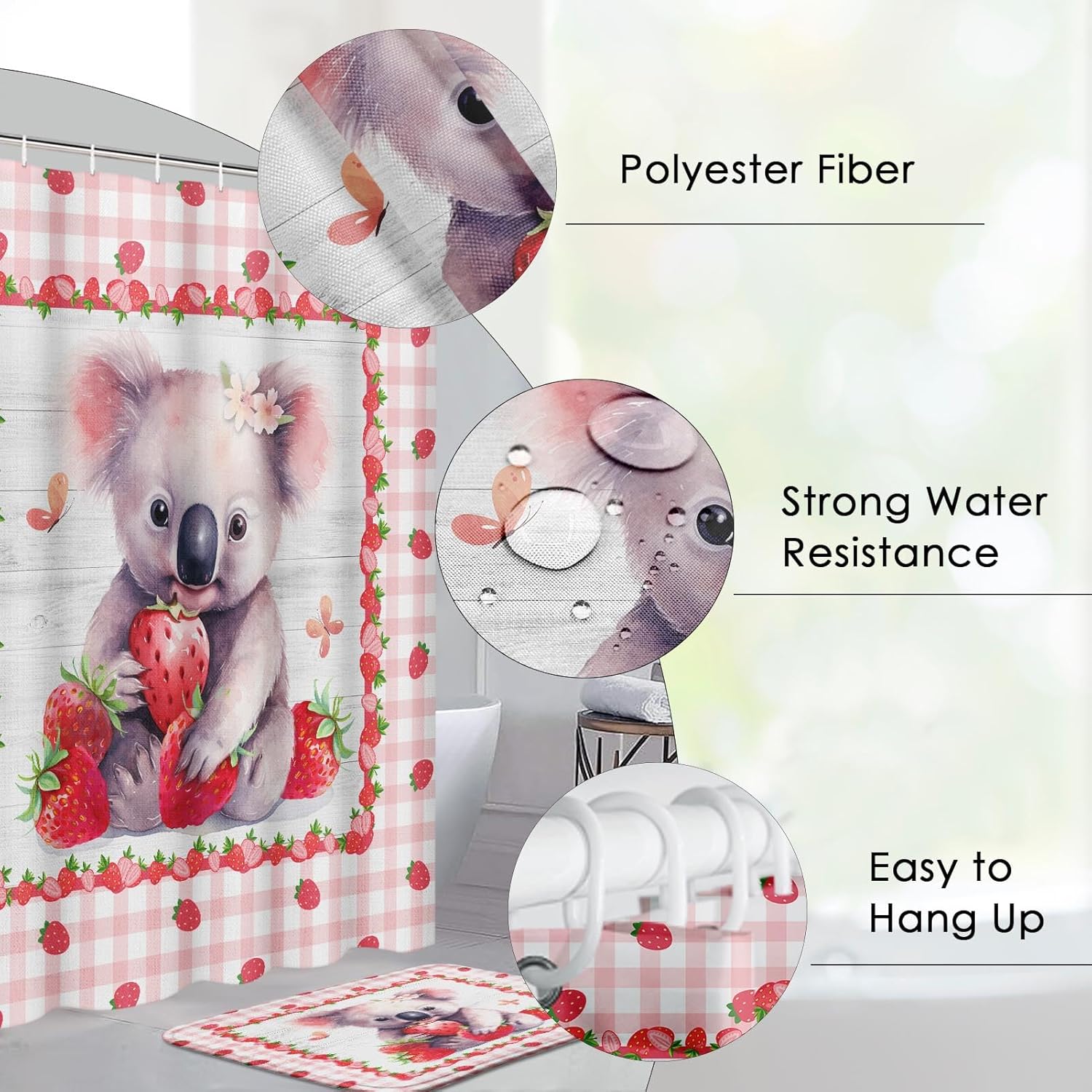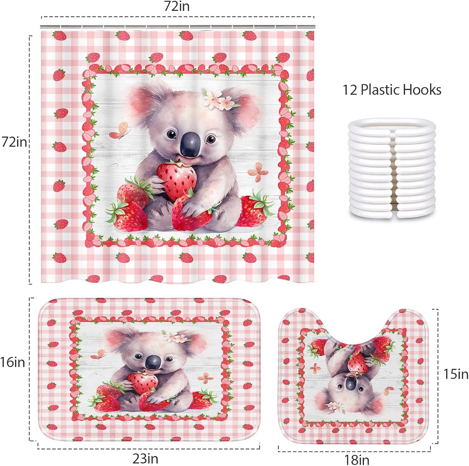 4 Pcs Shower Curtain Sets, Strawberry Koala Bear Cute Waterproof Bathroom Sets with Non-Slip Rugs, Toilet Lid Cover and Bath Mat, 12 Hooks, Accessories Modern Home Bathroom Decor 72″ X 72″