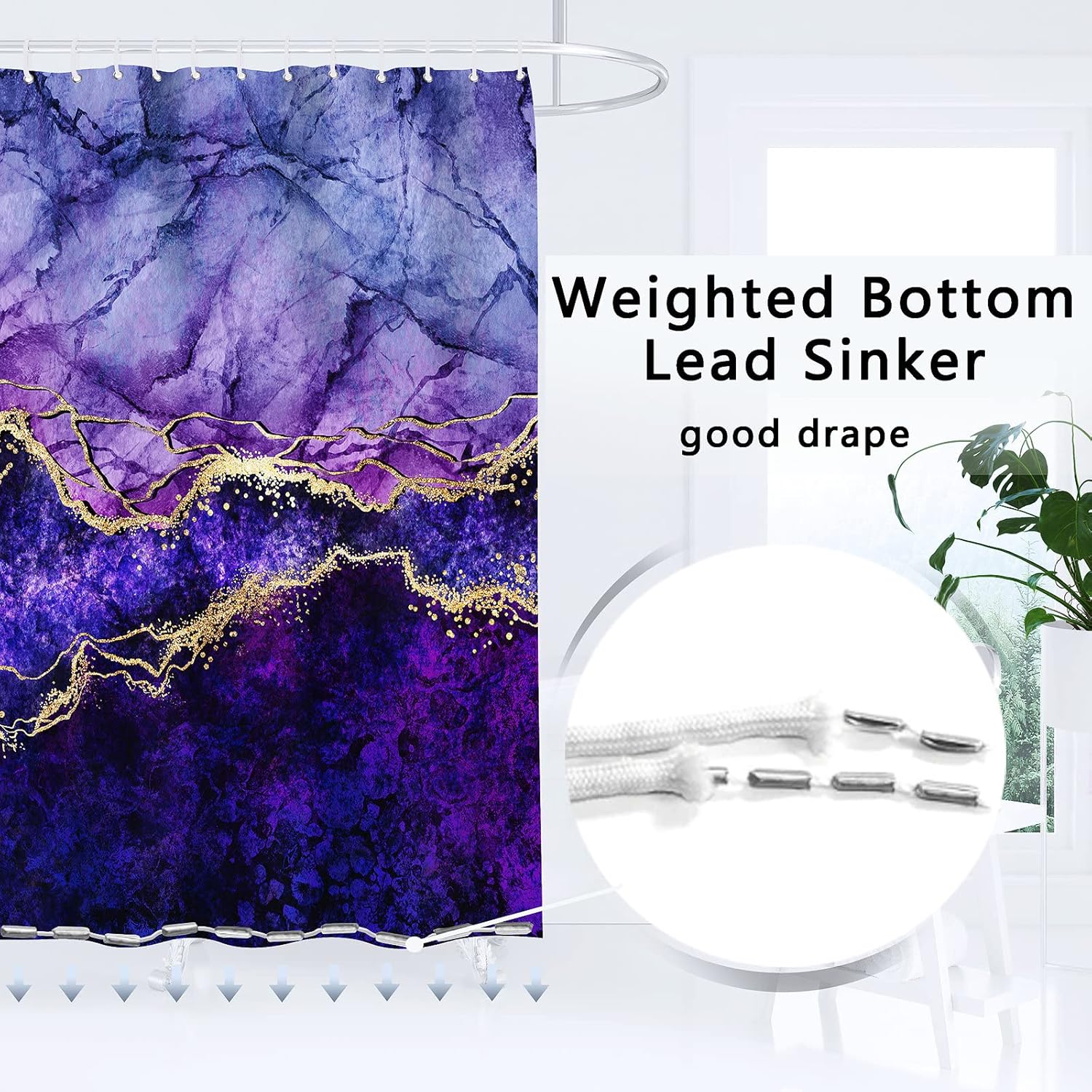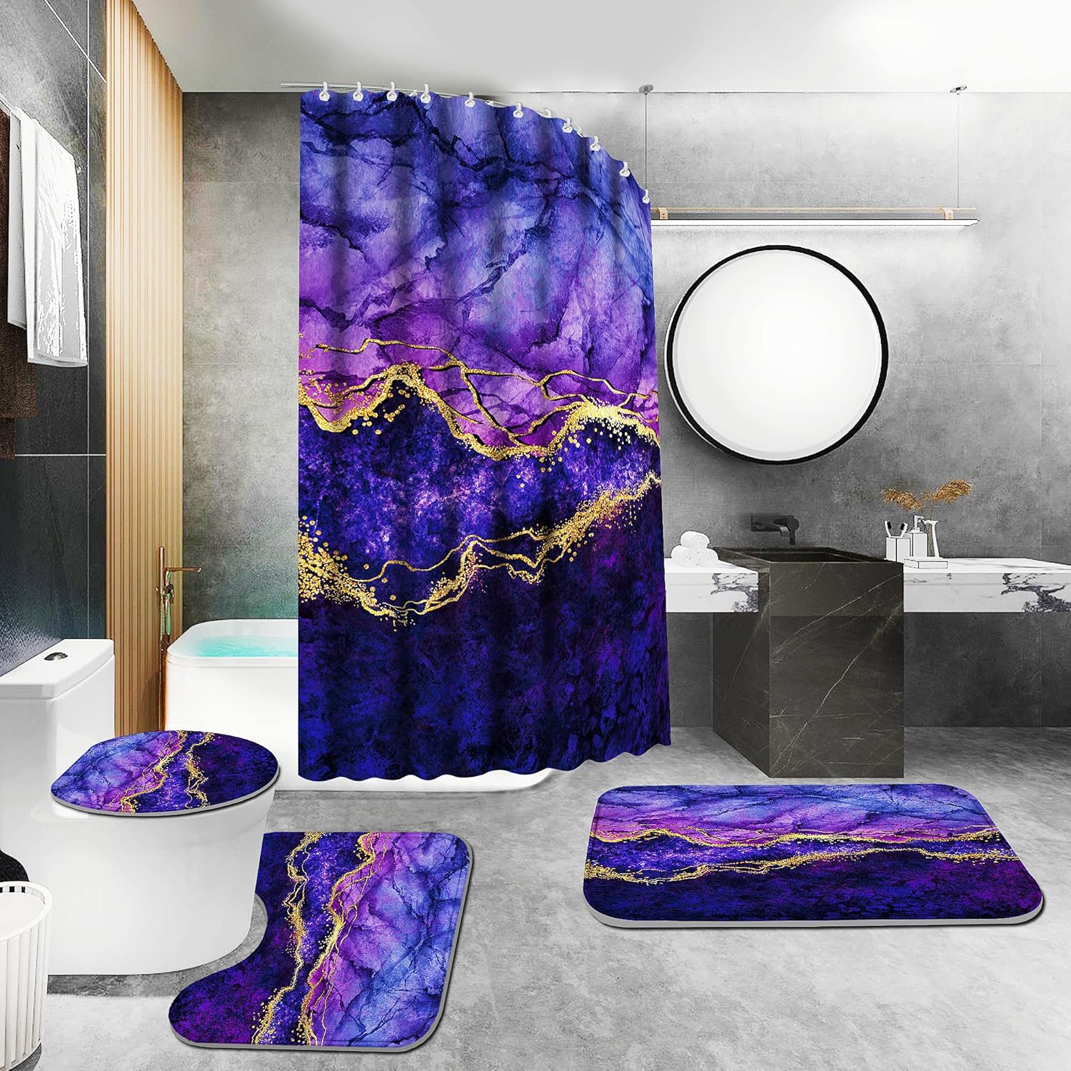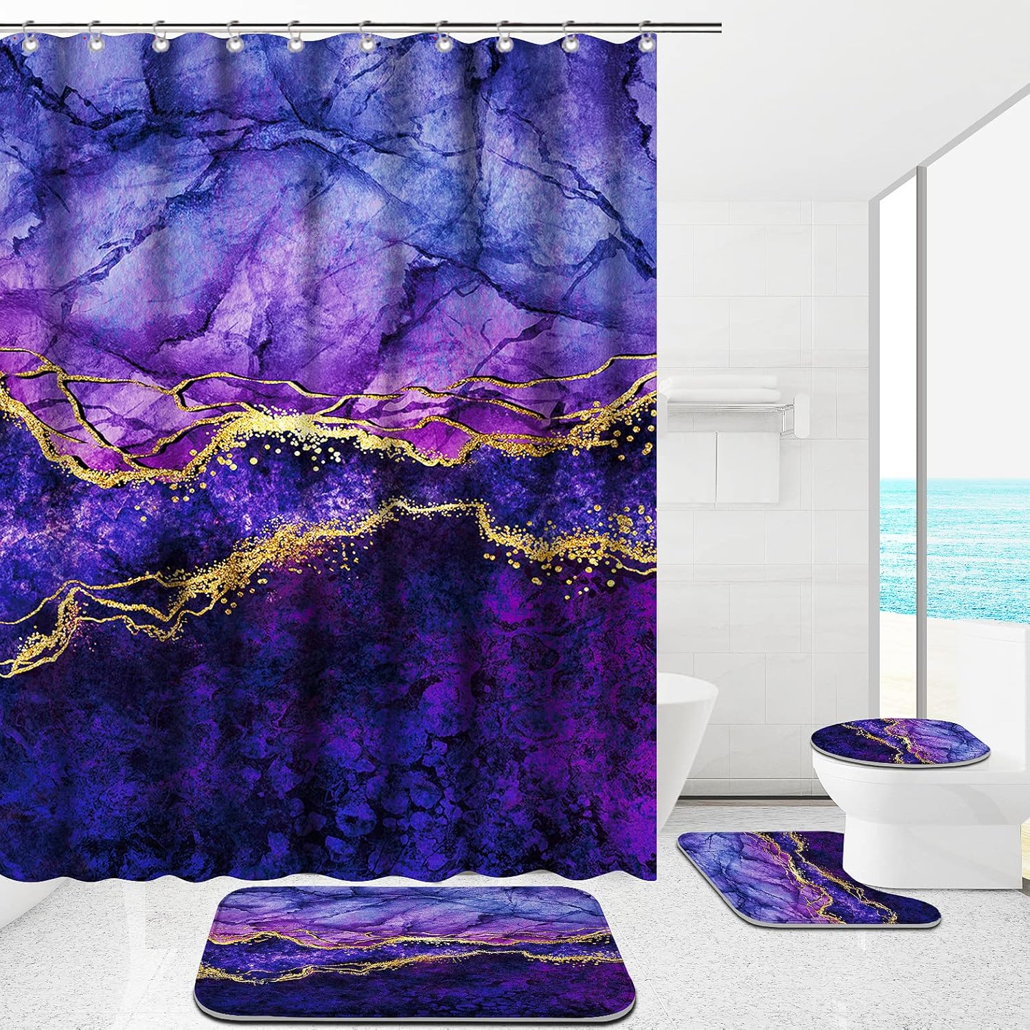 4 Piece Bathroom Set with Shower Curtain and Rugs, Gold Purple Bathroom Shower Curtain Set with Rugs, Incl Shower Curtain with 12 Hooks, Soft Bath Mat, U-Shaped Floor Mat, Toilet Lid Oval Rug