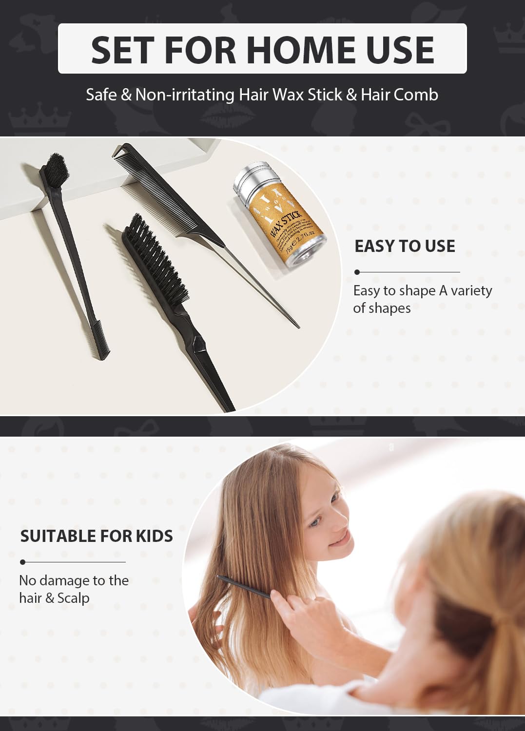 【Healthy and Mild Hair Stick】Hair stick wax is 100% made of castor oil, avocado oil, beeswax, vitamin E and other pure plants, deeply nourishes hair and enhances hair luster, while the rat tail combs kit is made of ABS material, which doesn’t hurt scalp hair.
