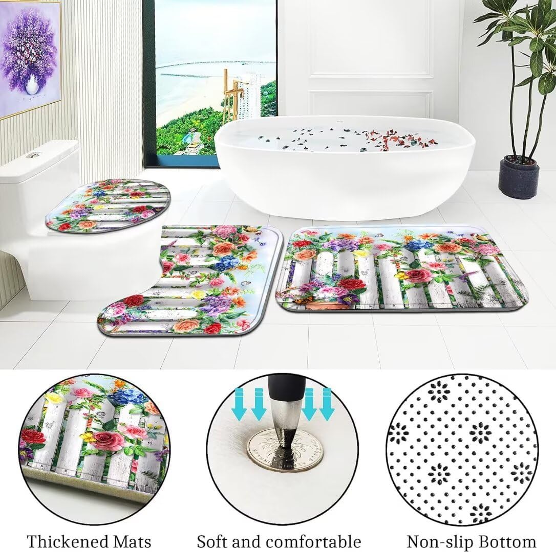 【Sizes】 Shower Curtain Size: 70.8″Lx70.8″W, Non-Slip Flannel Bathroom Mat Size: 29.5″LX 17.7″W, U-Shaped Rug Size: 17.7″LX 14.8″ W, Toilet Lid Cover Size: 17.7″LX13.8″W. This shower curtain set can fit most home bathrooms.