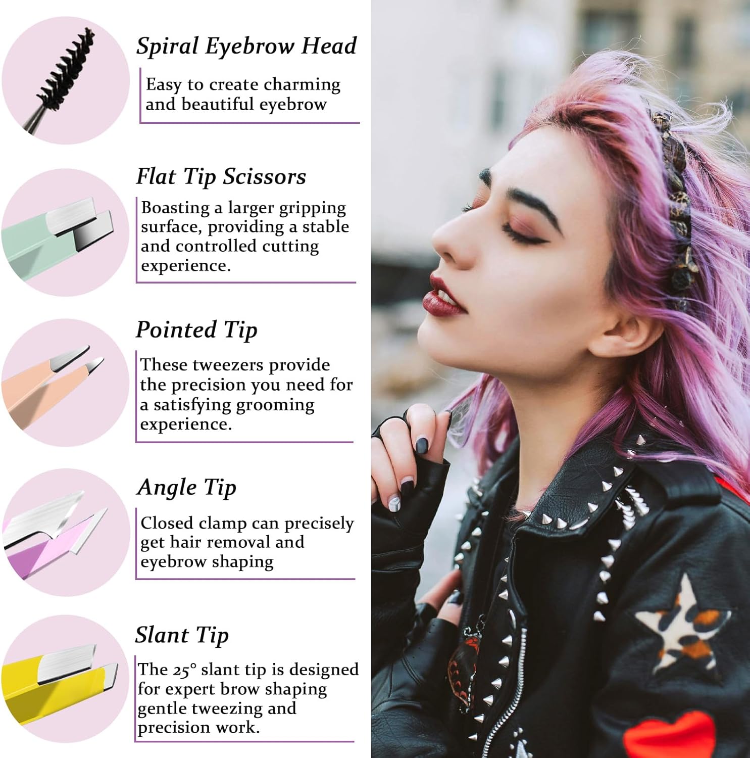 Versatile Collection: This comprehensive set includes four unique tweezers – facial hair tweezers with pointed, flat, slanted, and hooked tips, along with a flexible eyebrow brush. Each tweezer is specifically designed to cater to various hair removal needs, from chin hair to stubborn ingrown hairs.
