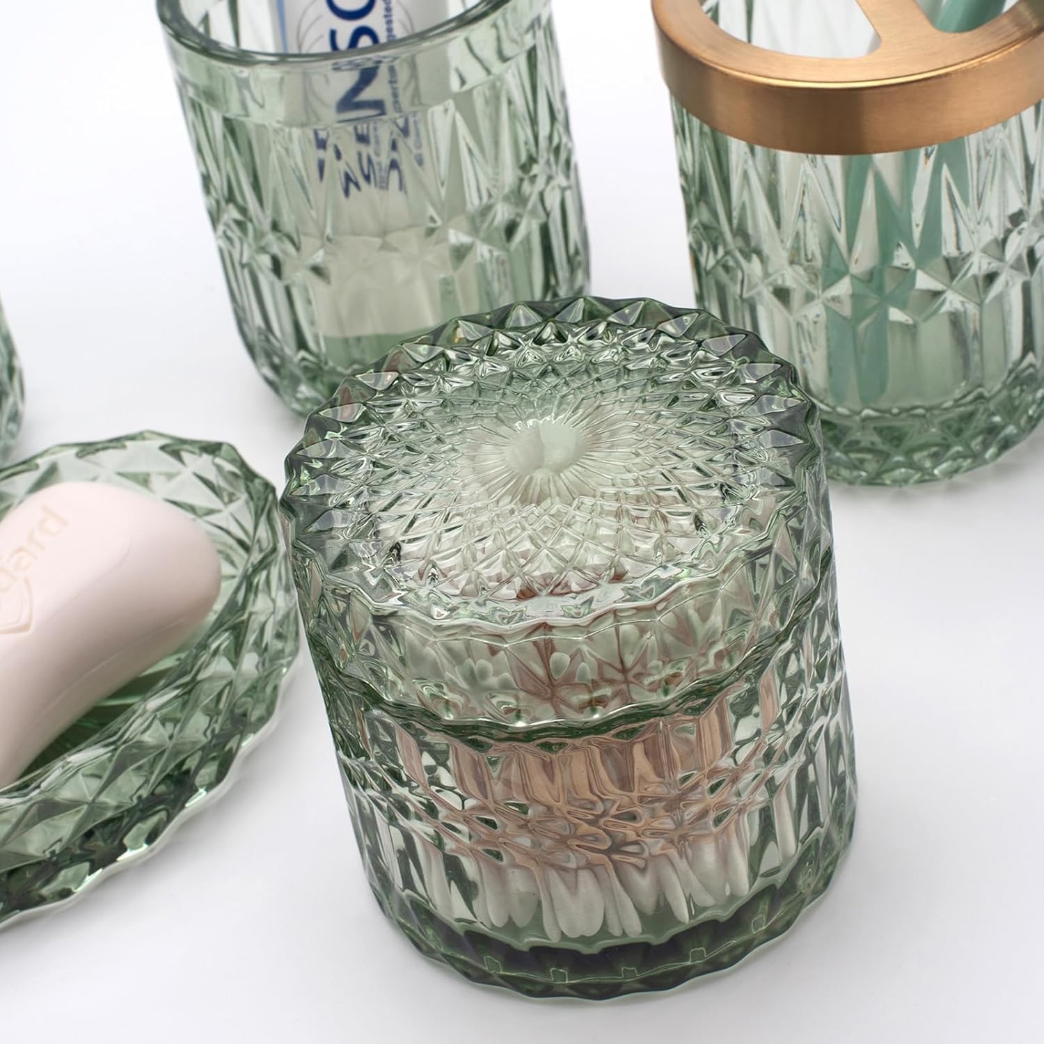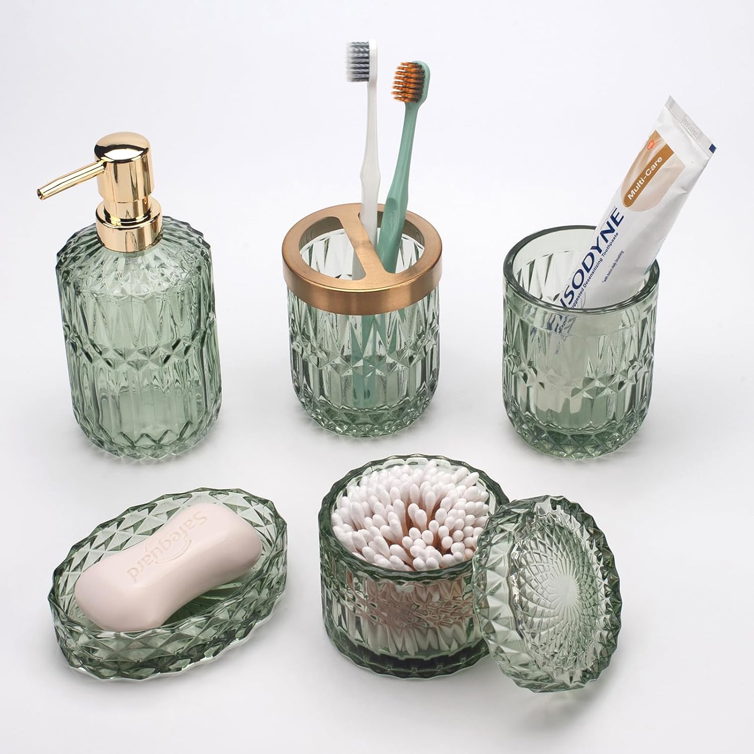 5PCS Green Glass Bathroom Accessories Sets of Lotion Dispenser, Soap Dish, Toothbrush Holder, Tumbler, Cotton Swab Jars, Modern Bath Decor, Vintage Gift
