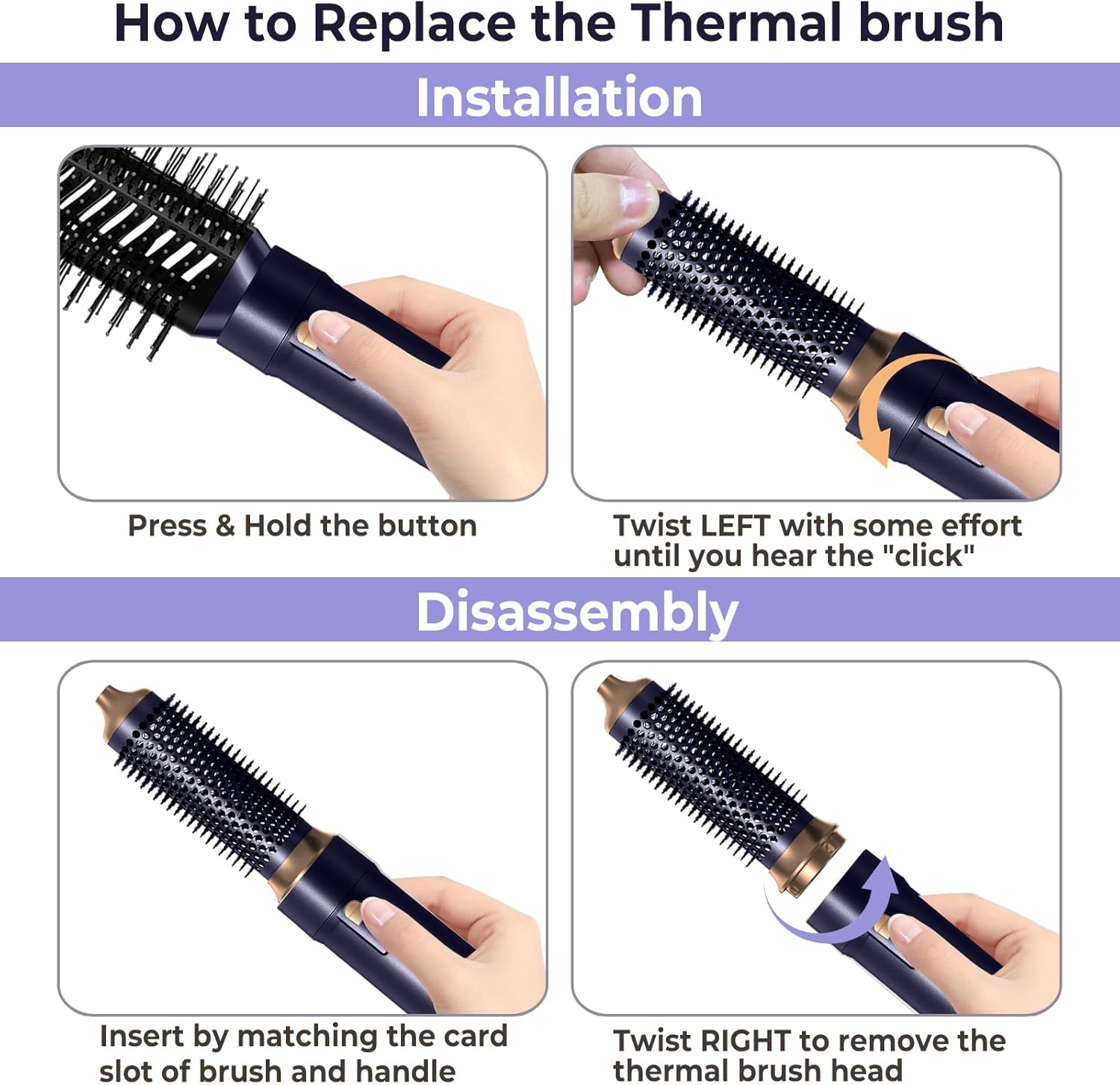 【6 IN 1 Styling Tools & Appliances】This 6 in 1 brush blow dryer kit includes 1*hair dryer, 1*straightening brush, 2*left right hair curlers, 1* thermal brush for straightening and volumizing, 1*Massage hot brush. left hair curler: put the hair tail on the curling iron from the left direction, and then hair will be absorbed on it, right curler is opposite operation. This 6 in 1 hot air brush kit meet all your different needs.Note: Children please use under the supervision of parents.