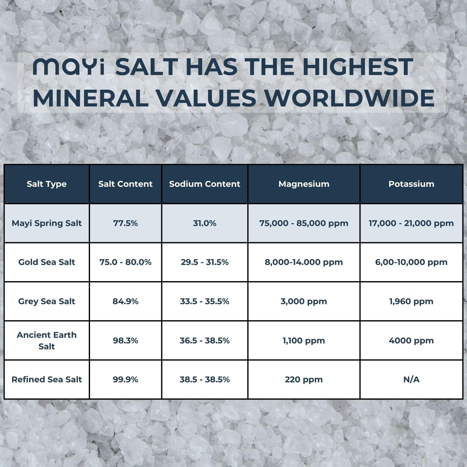 Mayi Salt is natural spring salt. It is the rarest salt source on earth.