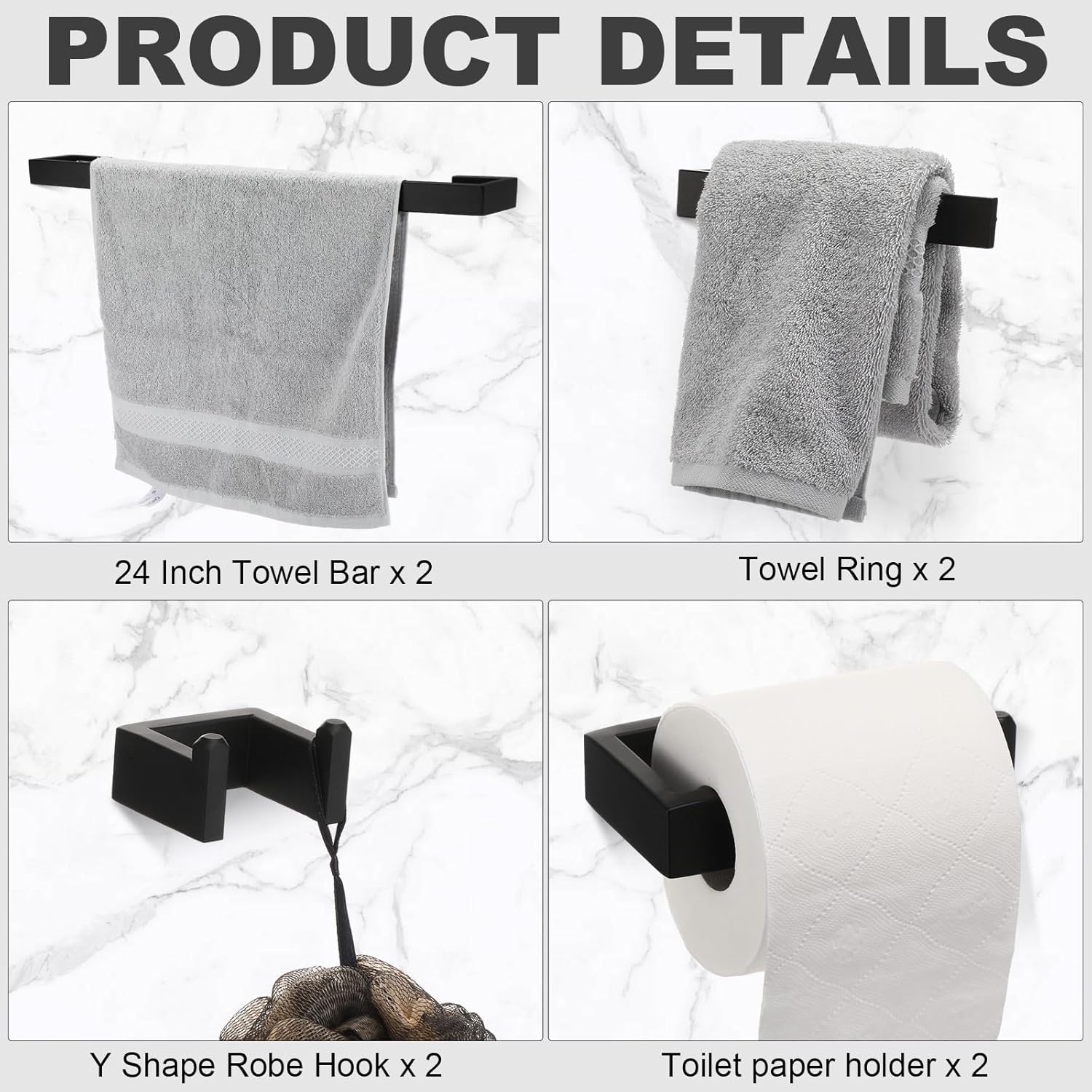 Quality Bath Hardware Set: the brushed stainless steel bathroom accessories, including 2 pcs 23.6 inch square brushed stainless steel towel bar, 2 hand towel bar, 2 toilet paper holder, and 2 double bathrobe hooks are made of 304 stainless steel material; The metal construction can make you get many years of use out of this brushed stainless steel square bathroom hardware set