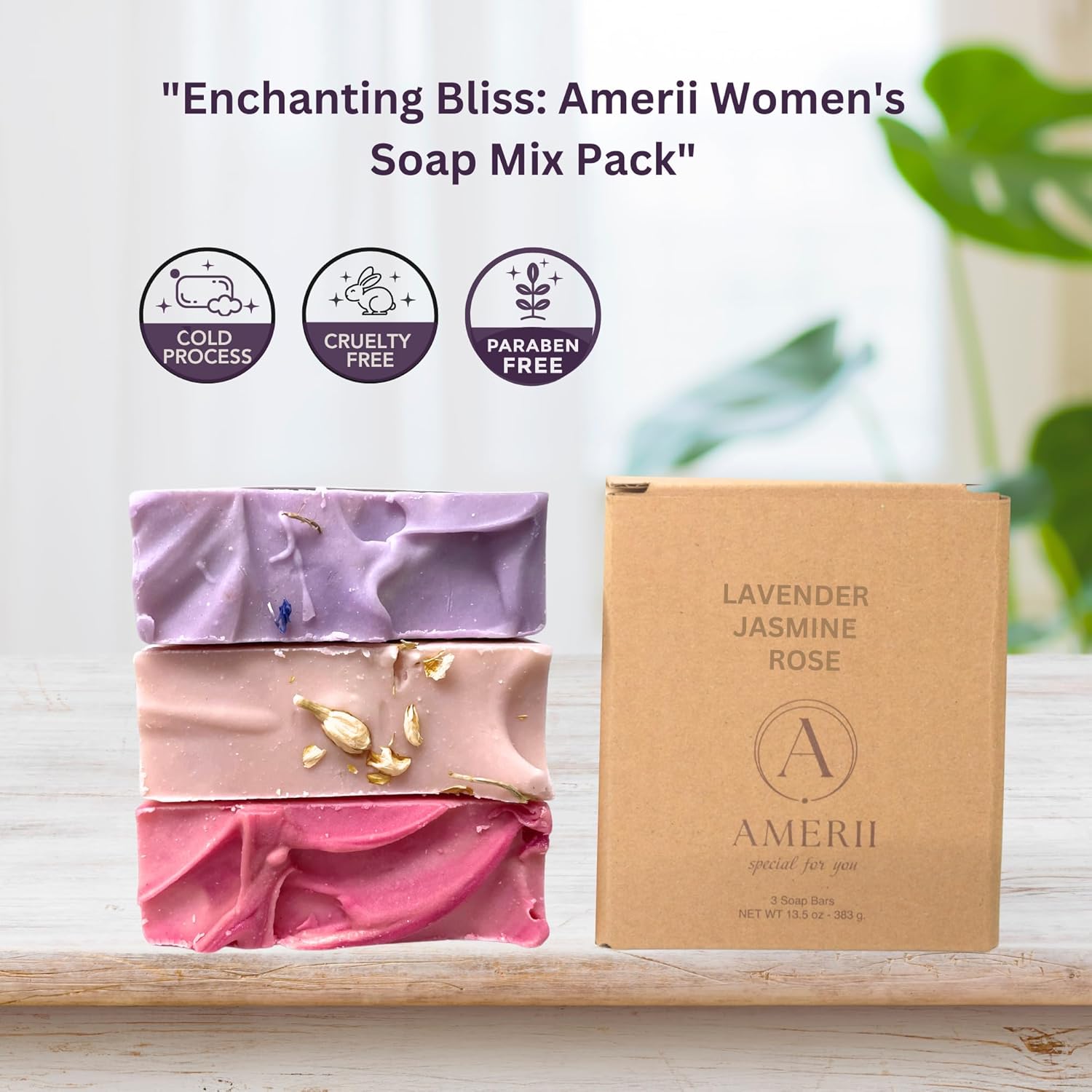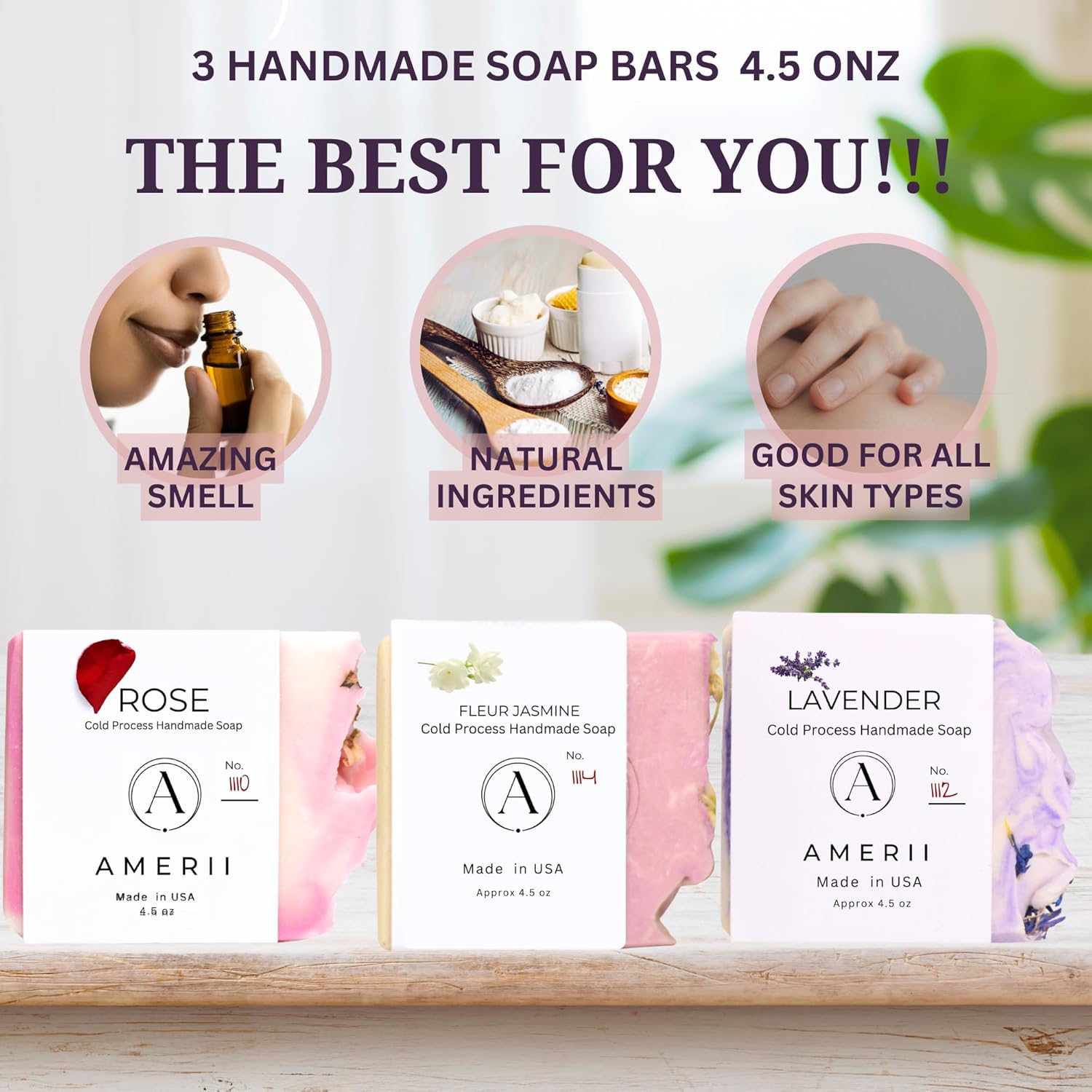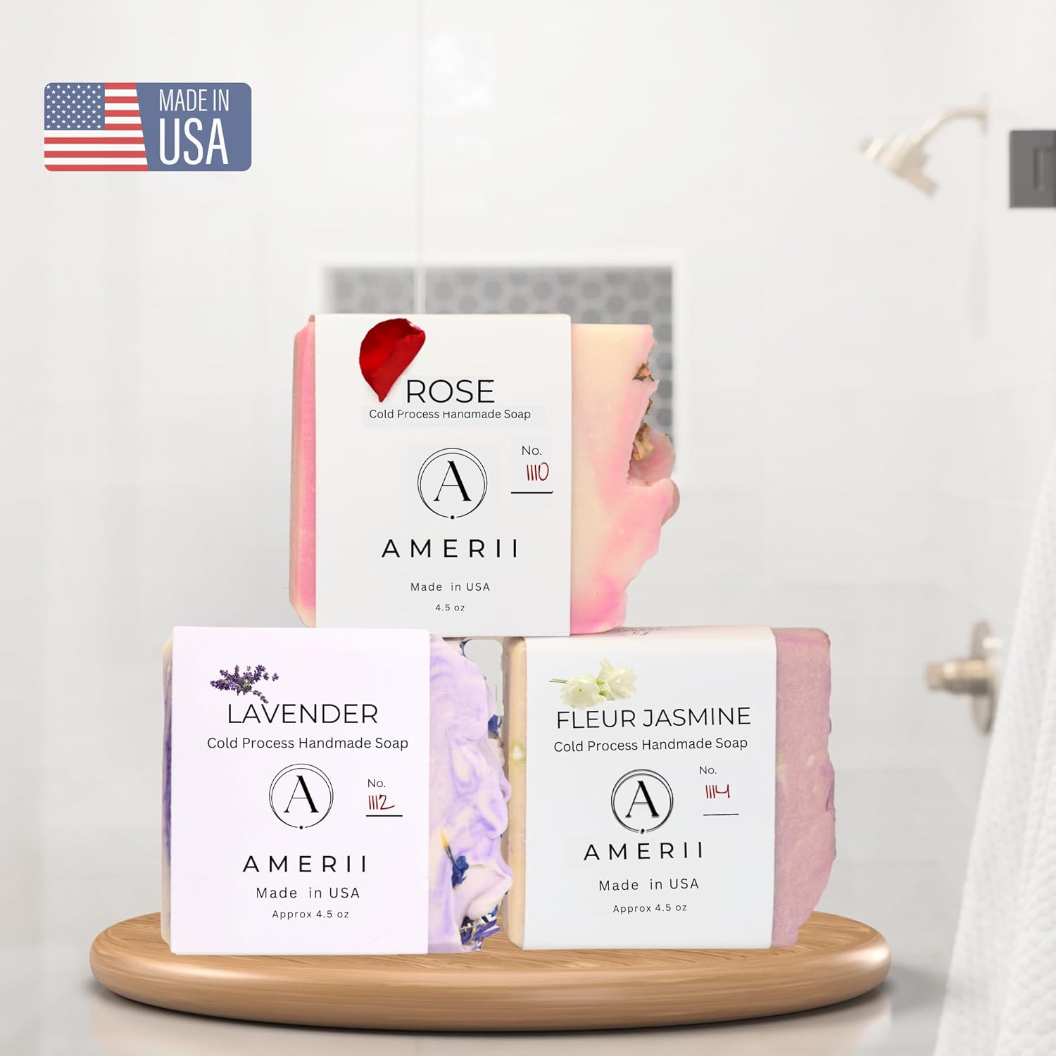 Amerii Floral Soap Bar – Artisan All-Natural Handmade Soap (3 Pack) – Organic Body and Face Soap Bar, Cold Pressed- Vegan Natural Bar Soap- Essential Oils Lavender- Rose – Jasmine 13.5onz