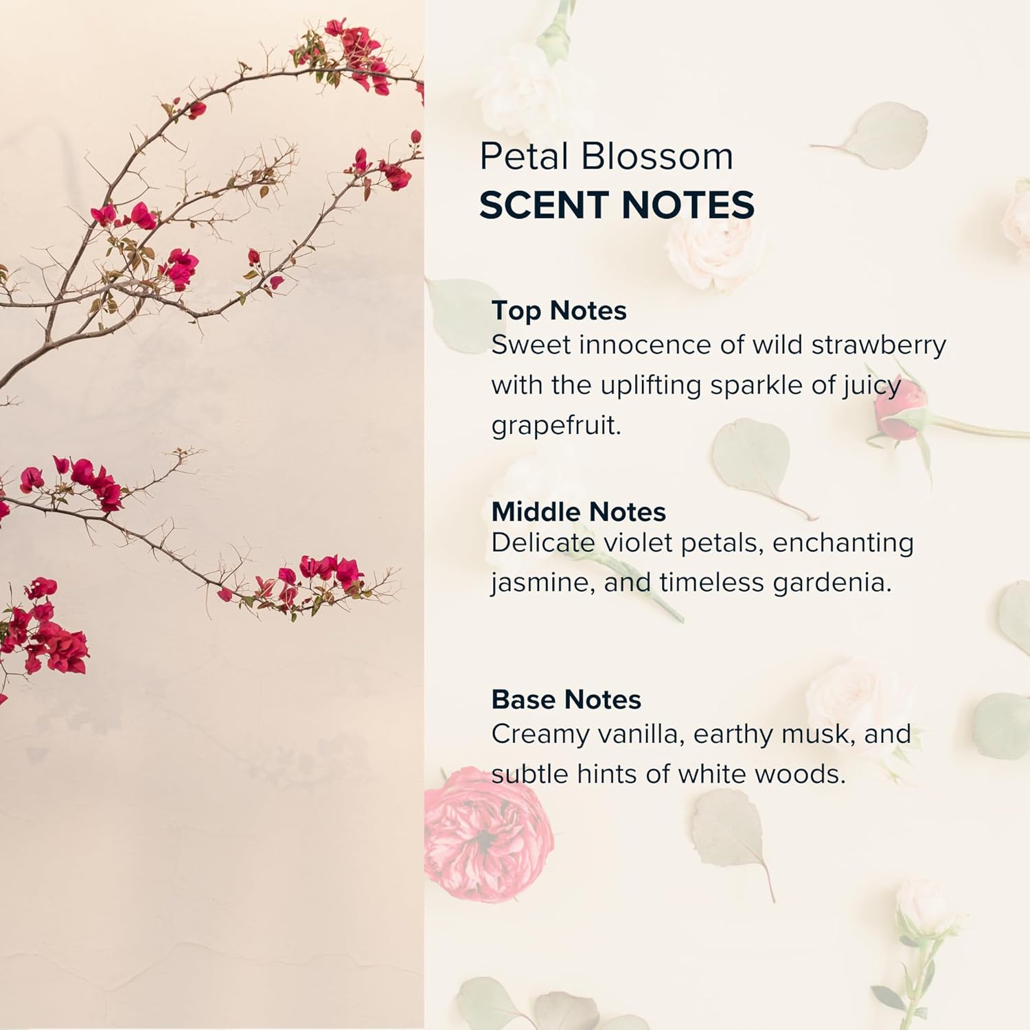 PETAL BLOSSOM: Opening notes blend the sweet innocence of wild strawberry with the uplifting sparkle of juicy grapefruit. As the fragrance unfolds, the heart notes reveal a captivating bouquet of delicate violet petals, enchanting jasmine, and timeless gardenia, creating a harmonious symphony of femininity and grace. The base notes of Petal Blossom roll on perfume leave a lasting impression with the warm embrace of creamy vanilla, earthy musk, and subtle hints of white woods.