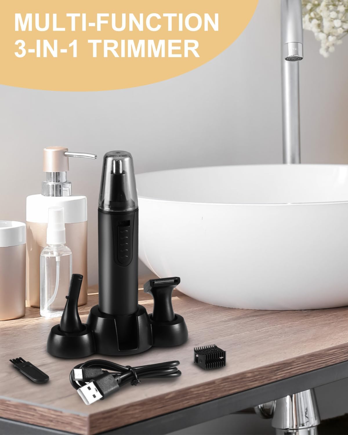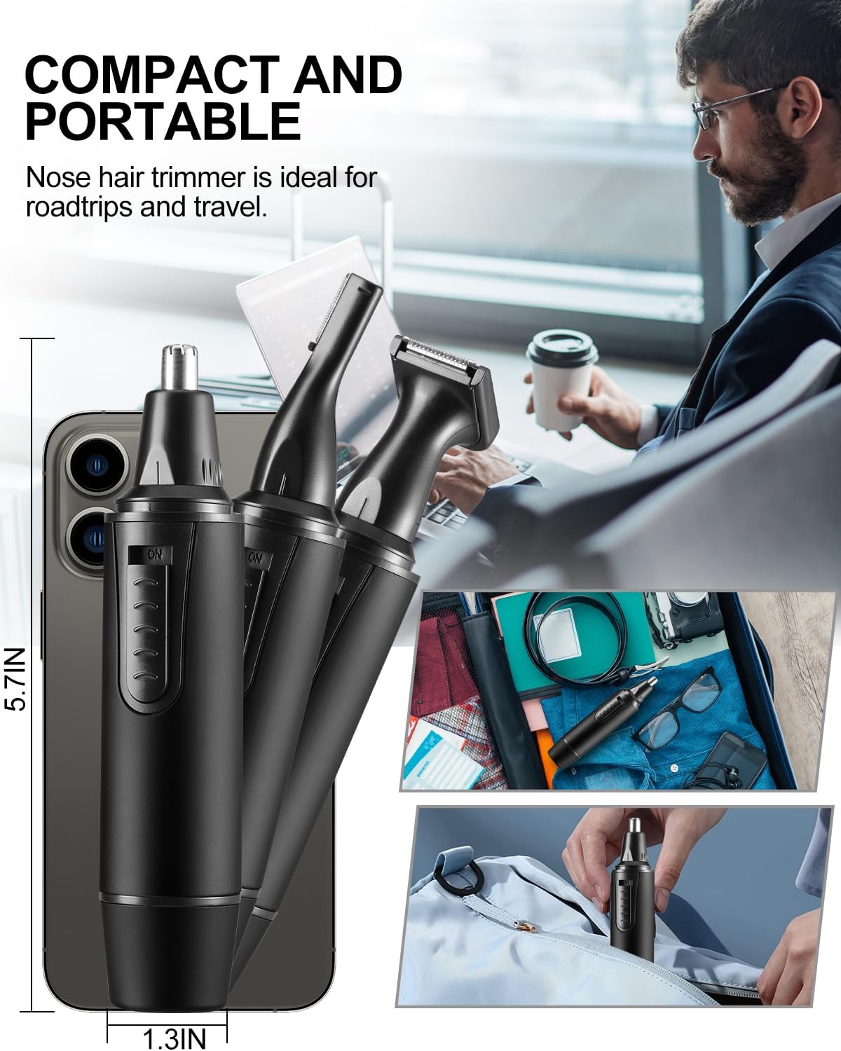 【3 IN 1 VERSATILE HAIR TRIMMER】: This 3 in 1 electric ear and nose hair trimmer kit including nose hair trimmer, beard trimmer, ear hair trimmer and eyebrow trimmer blade, can effectively remove the unwanted hair from your nose, ears, sideburns, beard and face,meeting your different needs in one multi-functional trimmer device.
