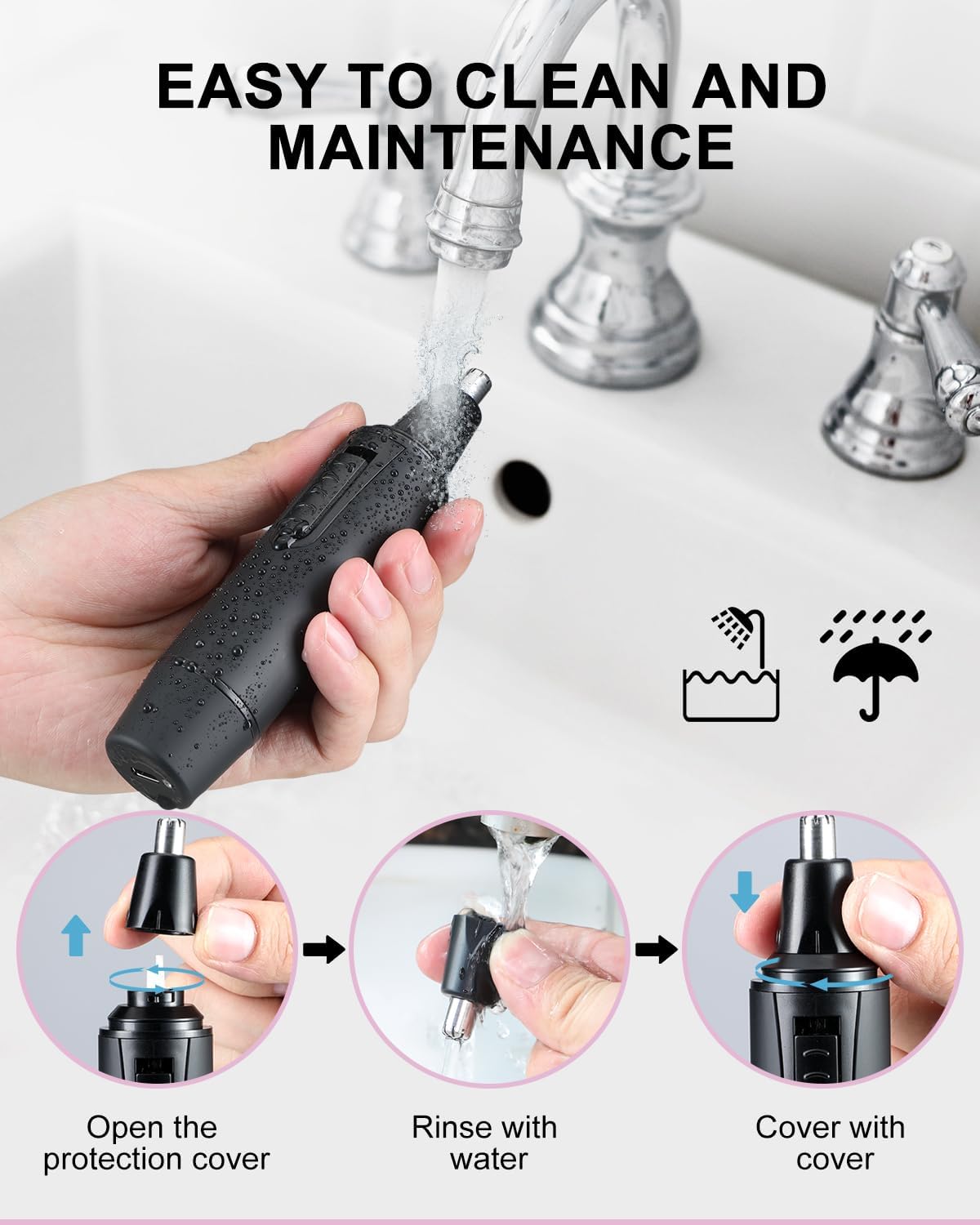 【IPX7 WATERPROOF AND EASY CLEANING】: This cordless mens nose hair trimmer, with washable and removable trimmer head for convenient cleaning and maintenance. Full body waterproof makes it free to shave or trim while taking a shower.