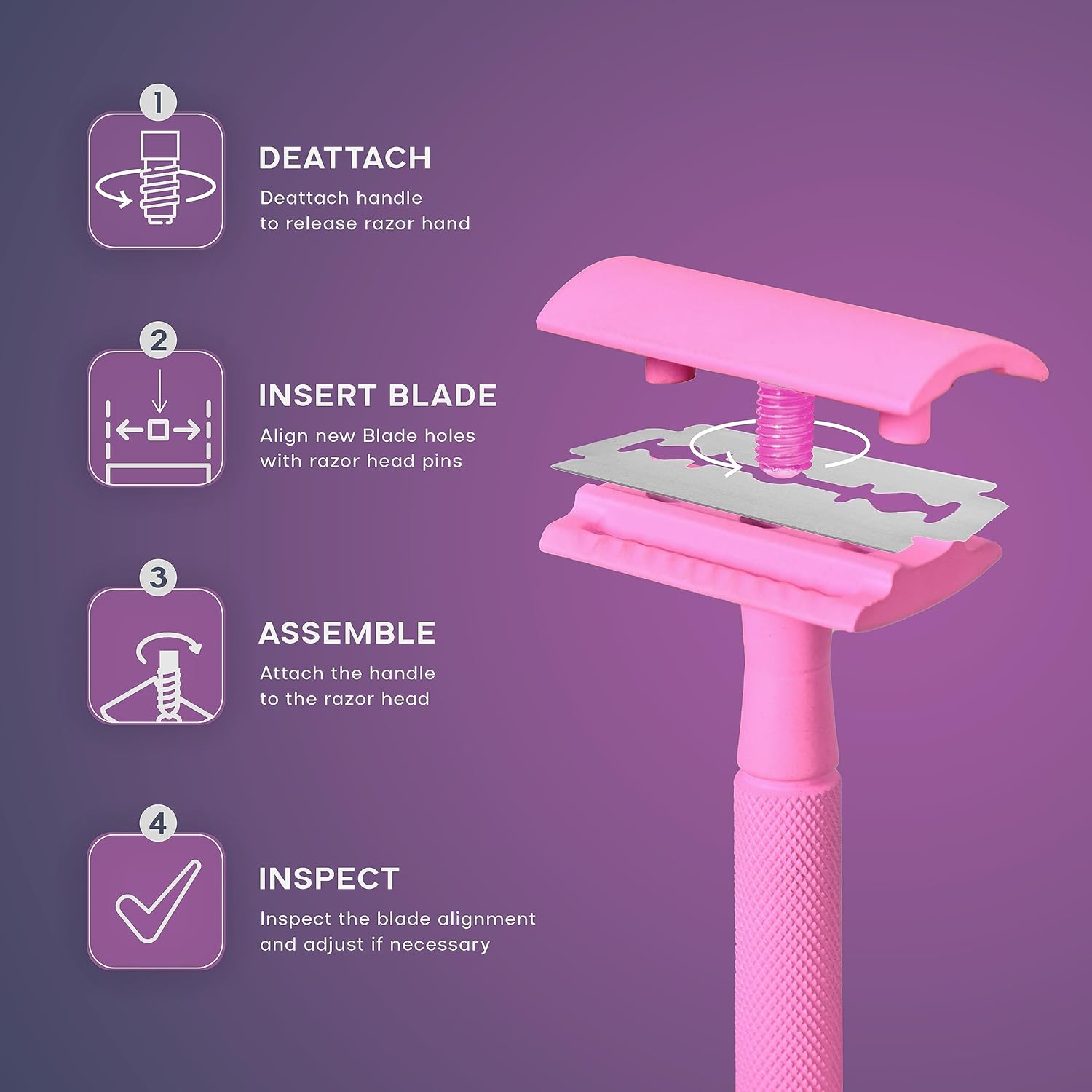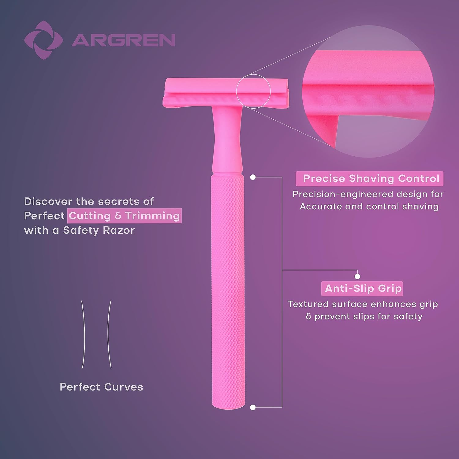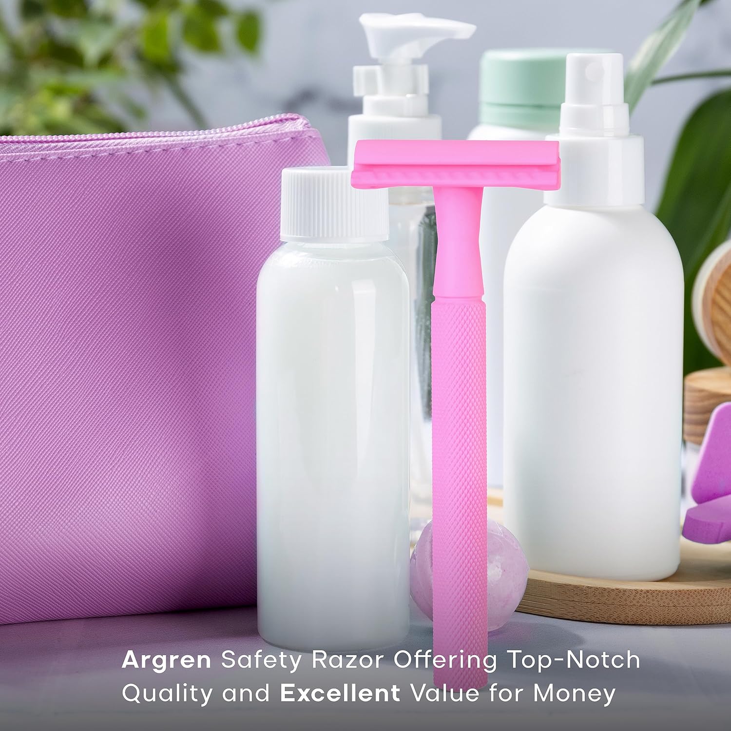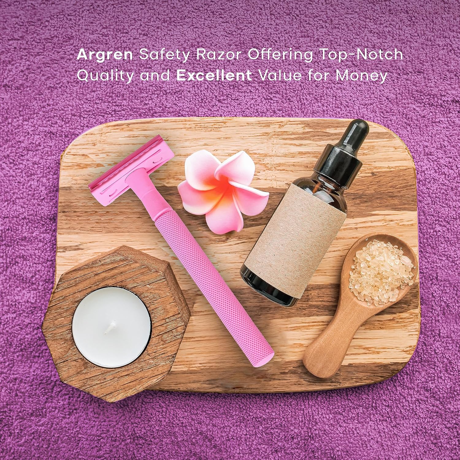 Argren Reusable Safety Razor Great for Shaving & Removing Hair – Well Made Men & Women Razor with Extra 10 Double Edge Safety Razor Blades – Ideal Shaving Razors for Men & Women (Coated Silver) (Pink)