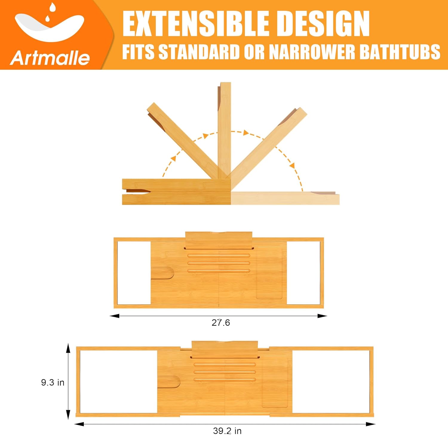 🛀🏼NON-SLIP, STURDY, WATERPROOF – Artmalle Expandable Folding Bamboo Bathtub Tray is made with customer safety as a top priority. There is a non-slip silicone grips on the bottom and a snap closure designed in the center of the back of bathtub caddy to secure the unfolded state, which allows the bath tray to remain extended and not folded during use, that people don’t have to worry about flipping it over, or splashing important personal items, cell phones, or tablets into the water.