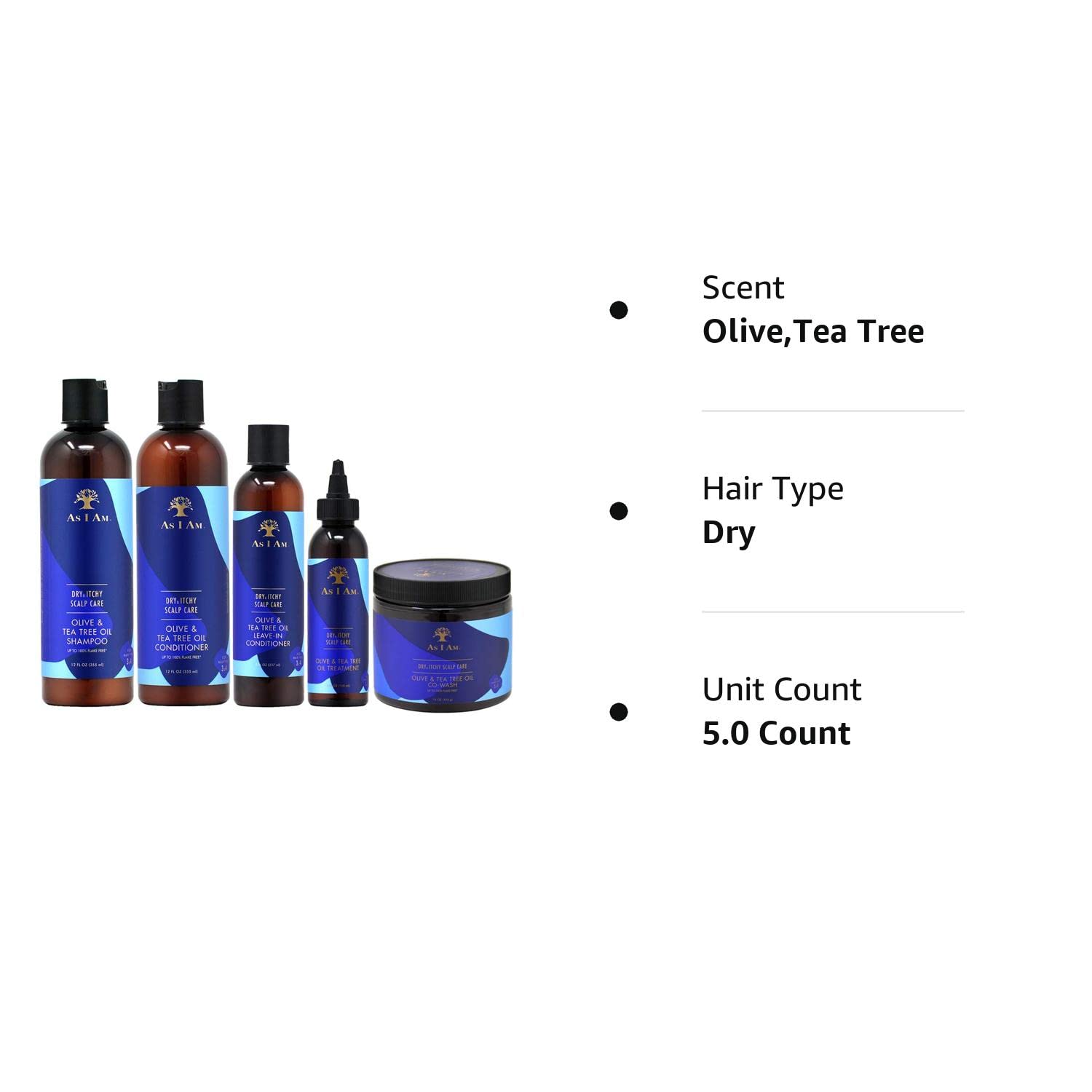 As I Am Dry & Itchy Scalp Care Olive & Tea Tree Oil Shampoo 12oz Itchy flakes are no more! Cleanse and moisturize your scalp leaving your hair refreshed. As I Am Dry & Itchy Scalp Care Olive & Tea Tree Oil Conditioner 12oz. Dandruff has met its match! This conditioner soothes dry and itchy scalp while adding the properties needed help detangle and moisturize hair.