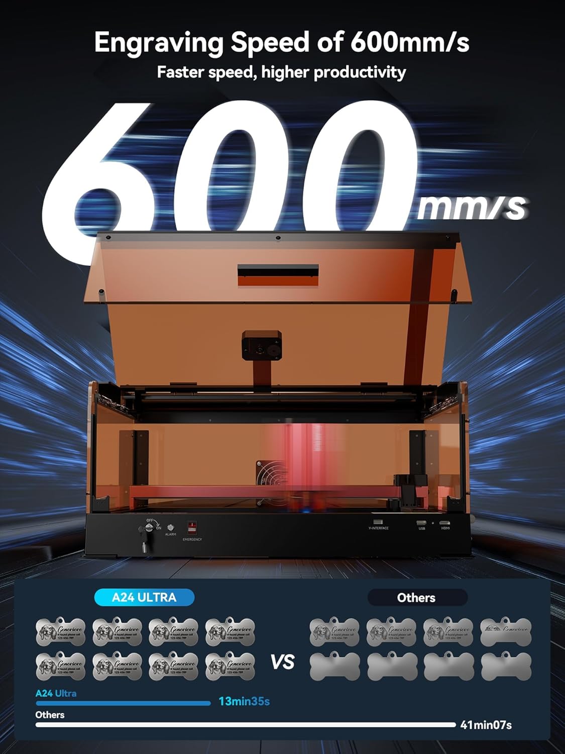 【Thicker Cuts & Efficient Engrave】A24 Ultra laser engraving machine features a robust 24000mW diode laser power, ensuring deep cutting and fast engraving. It’s equipped with precise belt tension adjustment and a super-fine 0.06*0.06mm laser spot focus, achieving accuracy within 0.004 inches, as powerful as an industrial CNC machine.It can effortlessly cut through 15mm wood and 10mm black acrylic in a single pass. Moreover, it excels in vibrant multi-color engraving on metal surfaces, breathing life into your creations.