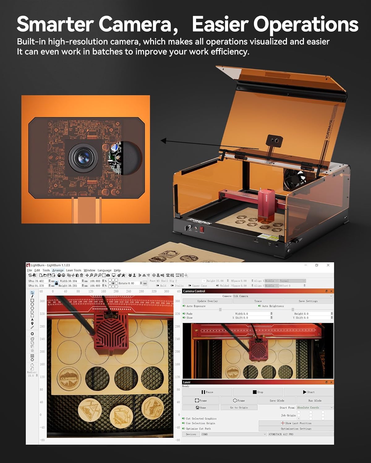 【PC Controlled Built in Camera】ATOMSTACK A24 Ultra features a built-in high-resolution camera, enhancing visualization of all operations and procedures. It can improve efficiency by working in batches for both engraving and cutting, requiring connection to PC software. Additionally, the camera enables automatic drawing scanning and intelligent pattern extraction from the surface of desired objects, eliminating the need for design software.