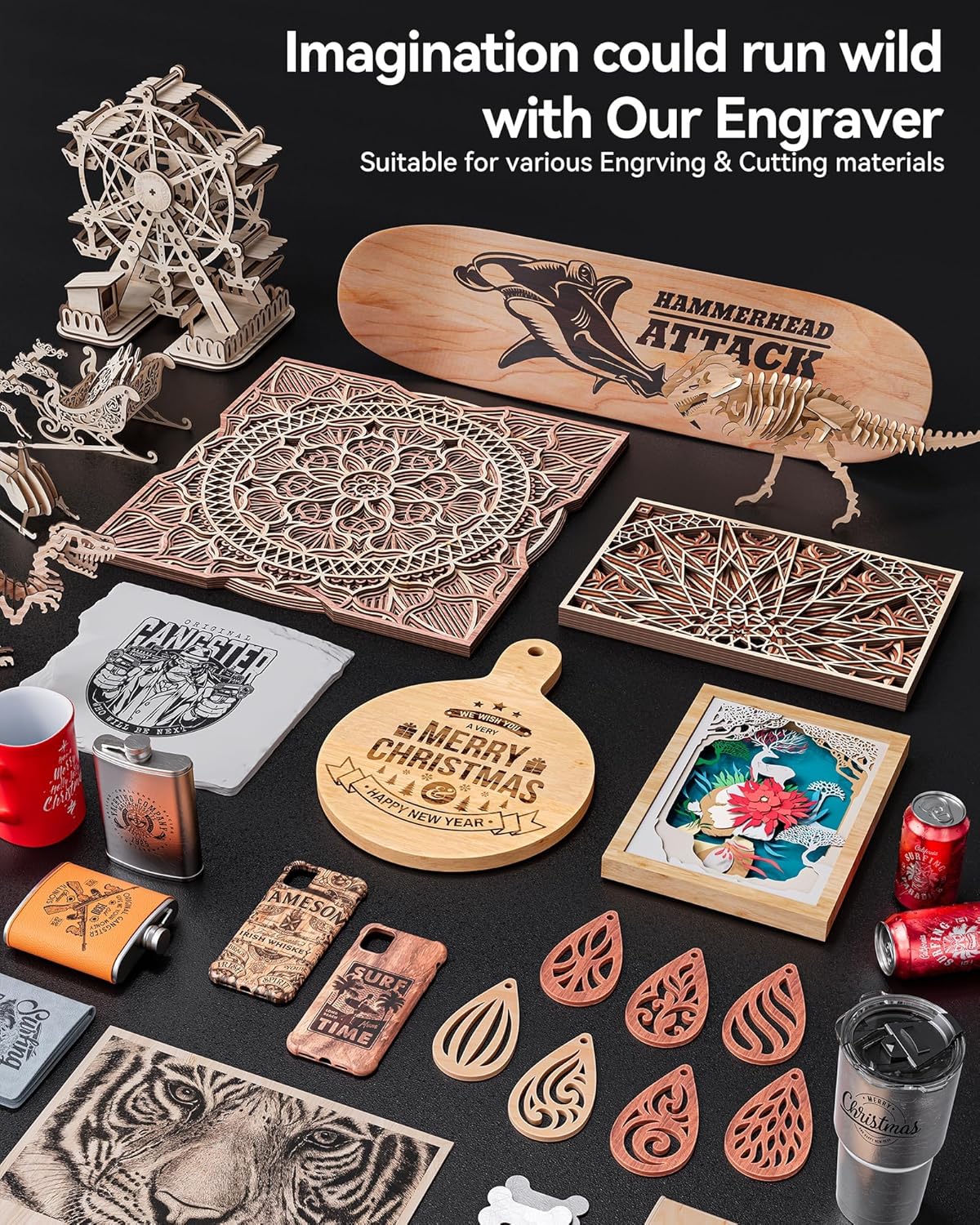 【New Design Laser Engraver with Enclosure & Camera】Our A24 Ultra laser engraver and cutter machine, designed with an enclosure and camera, is an ideal choice for home use. It effectively engraves and cuts various materials including paper, wood, leather, acrylic, metal, glass, and fabric. Each package includes the laser engraving machine, an enclosure with camera, and a compatible exhaust pipe.