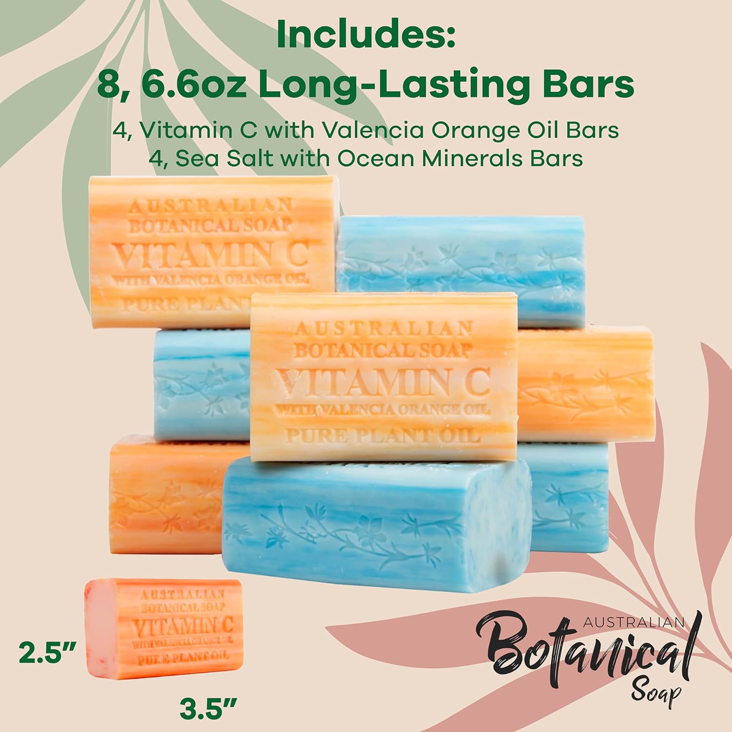 Australian Botanical Soap, Sea Salt with Ocean Minerals and Valencia Orange Soaps | All Skin Types | Shea Butter Enriches | 6.8 oz. (193g) | 4 Bars of Each – 8 Pack
