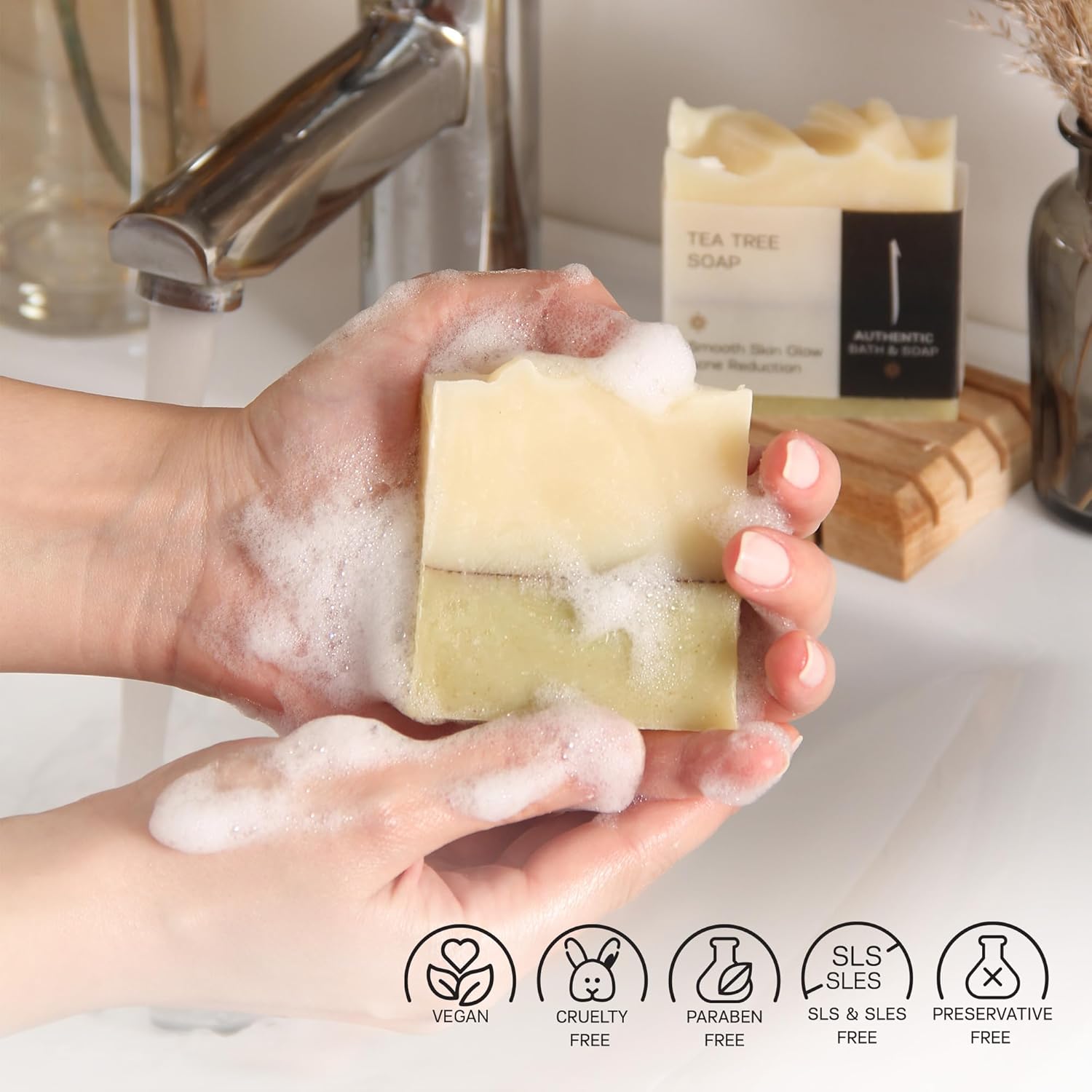 AUTHENTIC BATH & SOAP Cold Processed -Tea Tree Soap Bar- for Sensitive Skin, Fresh and Clean, Face & Body Wash for Man & Woman, Natural, Cruelty Free & Vegan, Fragrance Free. (Pack of 2) 4.2 Oz Each