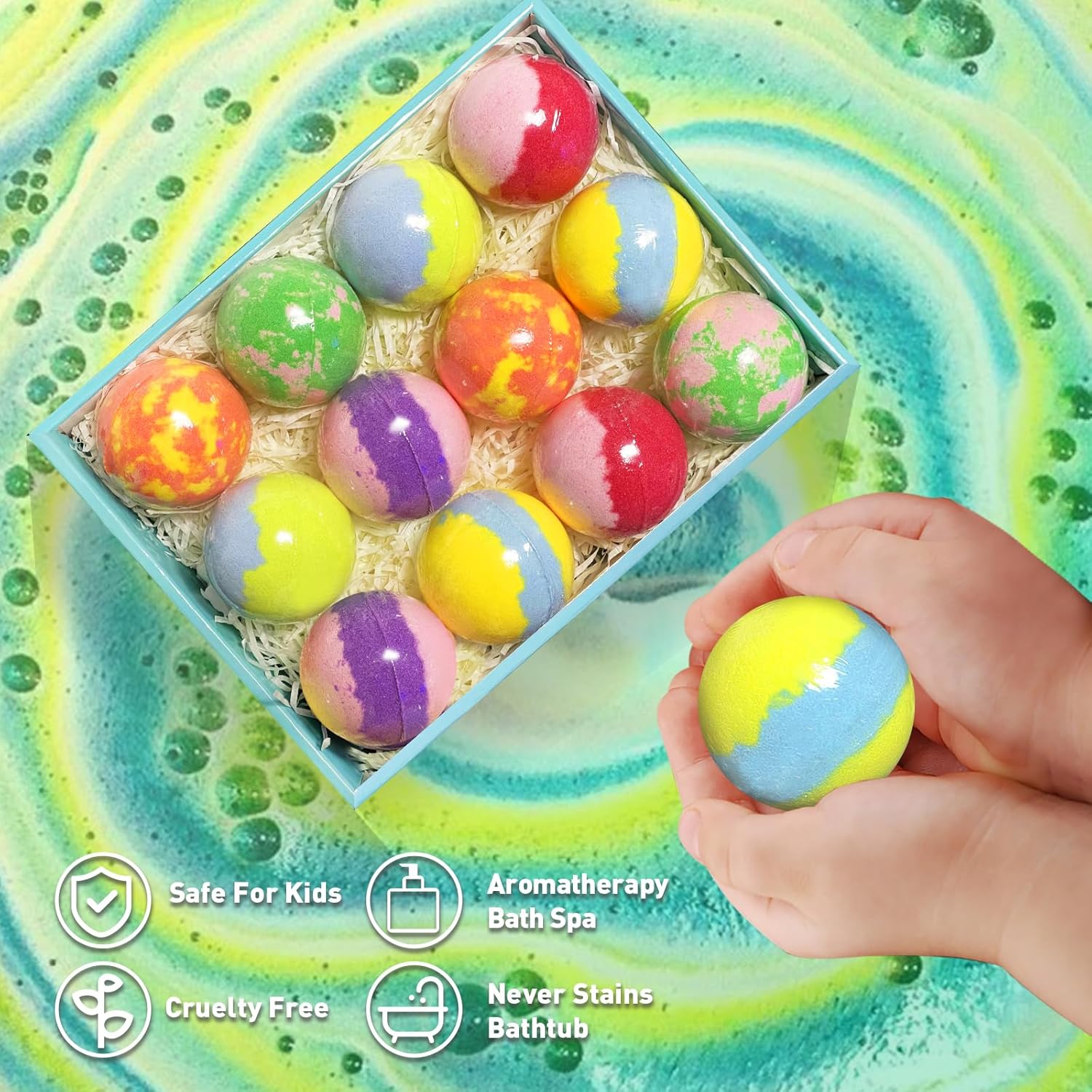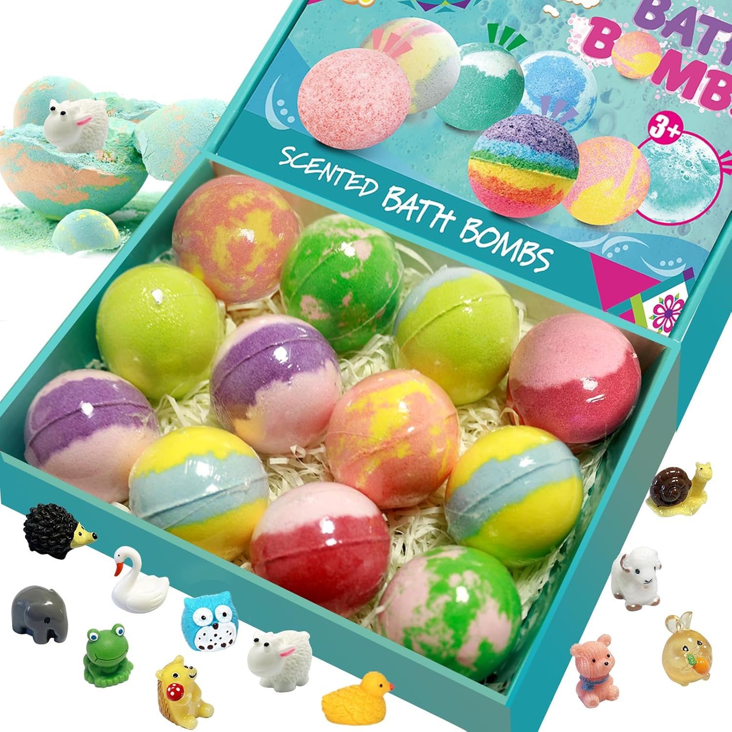 Bath Bombs for Kids, 12pcs Bath Bombs with Surprise Toys Inside, Natural and Organic Colorful Bubble Bath Fizz Bomb for Kids, Gift Set for Birthday, Halloween, Christmas for Boys and Girls